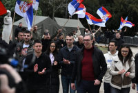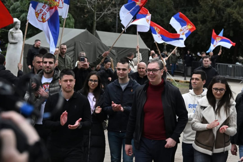 Predsednik Srbije Aleksandar Vučić obišao je studente koji žele da uče u Pionirskom parku. Oni su ga dočekali sa srpskim zastavama i uz aplauz.