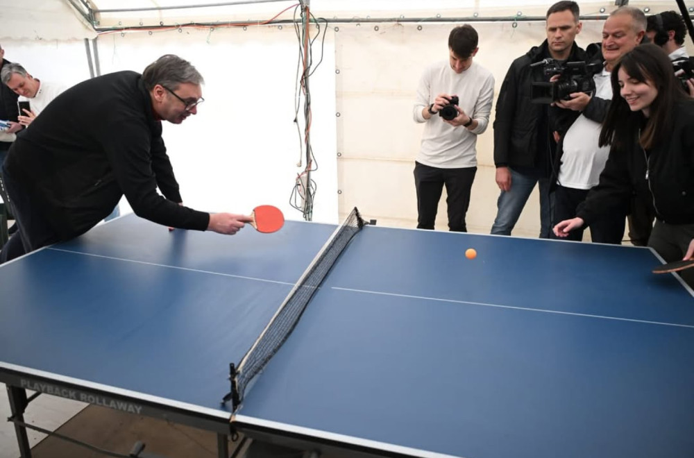 Vučić je na poklon dobio knjigu i zastavu iz Pionirskog parka, a zatim je sa studenetima igrao stoni tenis.