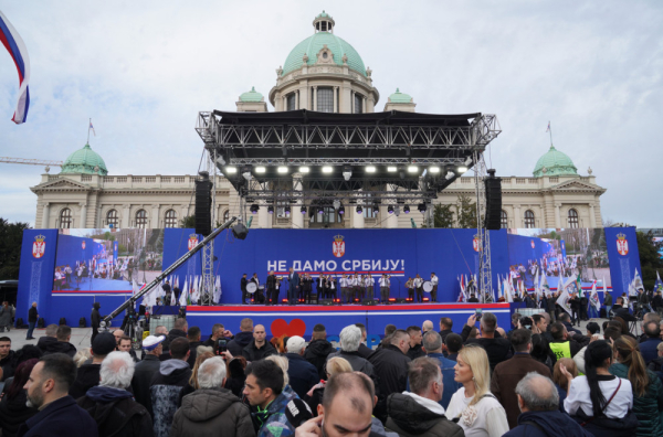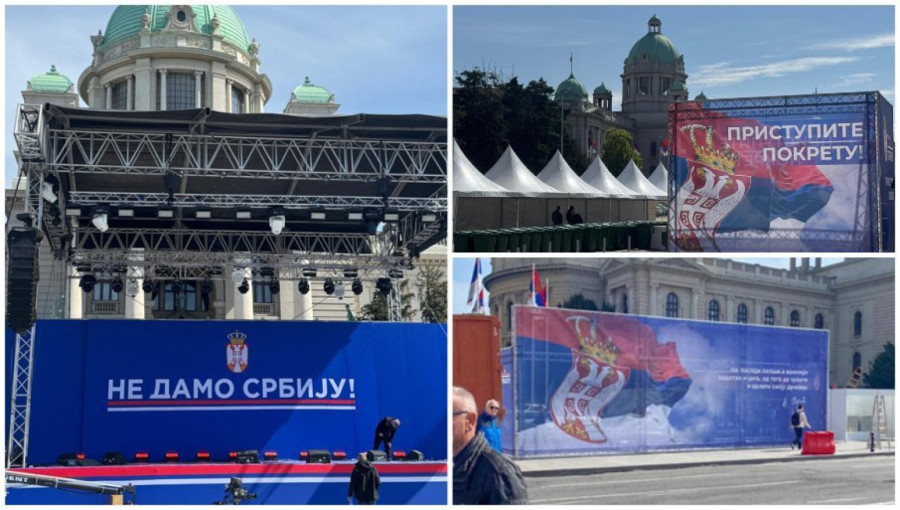 - Ispred Skupštine transparenti "Ne damo Srbiju", "Pristupite pokretu"; Čeka se Vučić i razvijanje zastave