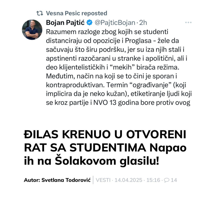 "… Dakle, kada se distancirate od stranaka i NVO nemojte to činiti uz argumentaciju da “nisu čisti”. Apsolutno je dovoljno reći da se distanca zauzima jer je studentska populacija politički heterogena, a vi želite da zadržite jedinstvo. Jasno, dovoljno, a ne vređaju se oni koji to, vrlo često, ne zaslužuju i ne ruše se mostovi preko kojih sutra valja preći", napisao je Pajtić na mreži Iks, a Vesna Pešić pokazala je slaganje sa iznesenim mišljenjem i podelila njegovu objavu.