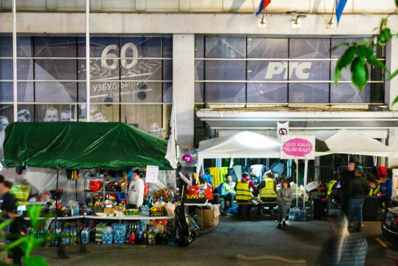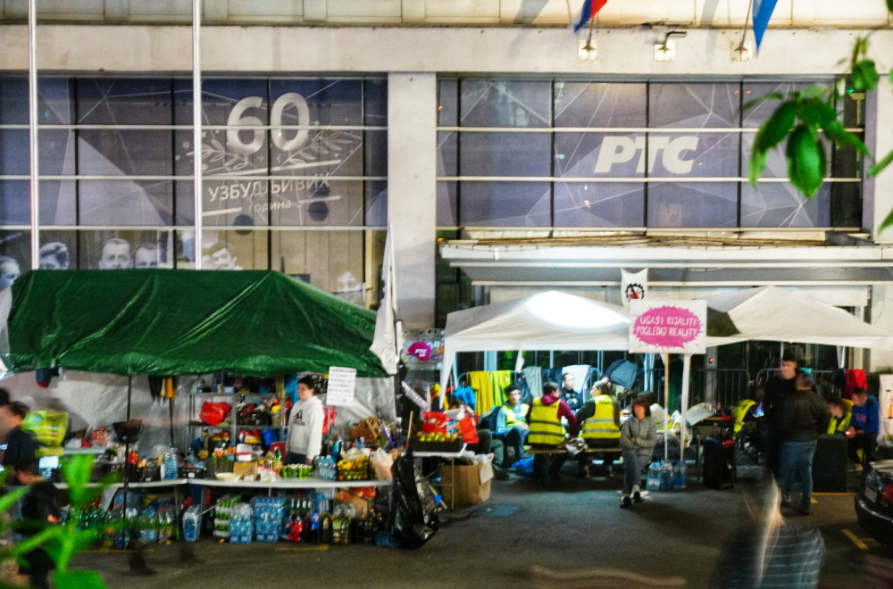 Studenti u blokadi i grupa građana koji su se okupili ispred zgrade RTS u Takovskoj 10 uzvikuju "Konkurs je raspisan, RTS je slobodan".