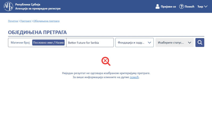 Pretraga Agencije za privredne registre takođe pokazuje isto – Fondacija "Better Future for Serbia" ne postoji.