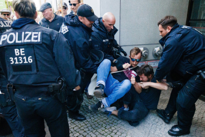 Na jednom snimku vidi se kako policajac u Berlinu privodi trinaestogodišnju devojčicu na protestu podrške Palestini dok joj uvrće ruku i drži oči prekrivene.