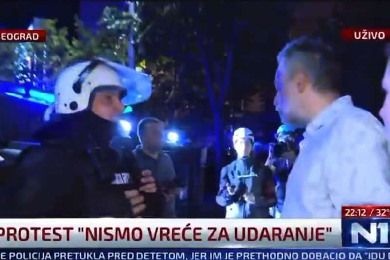Prema navodima medija, mirno, jasno, staloženo objašnjava blokaderima da su na neprijavljenom skupu, da se među blokaderima, sto se jasno vidi na snimku N1, nalazi mnogo maskiranih huligana, sa kaiševima, motkama, kamenicama, sa maskama na licima, objašnjava im da se sklone na bezbedno i da čak i na neprijavljenom skupu mogu mirno, ali mirno da protestuju.