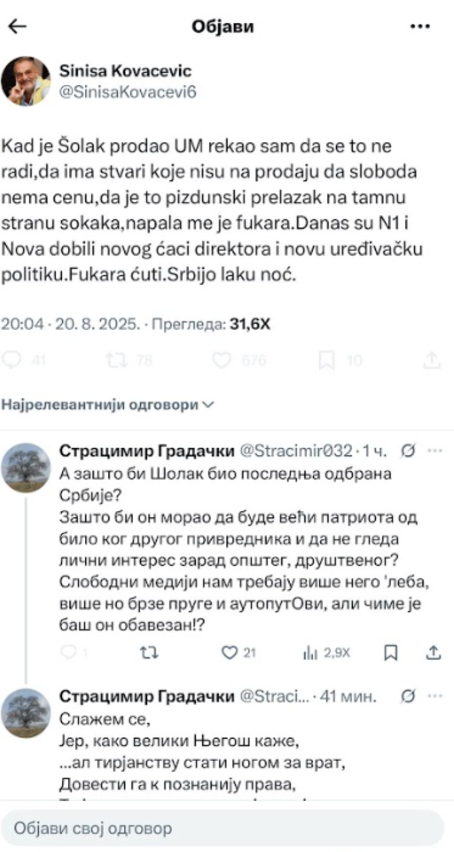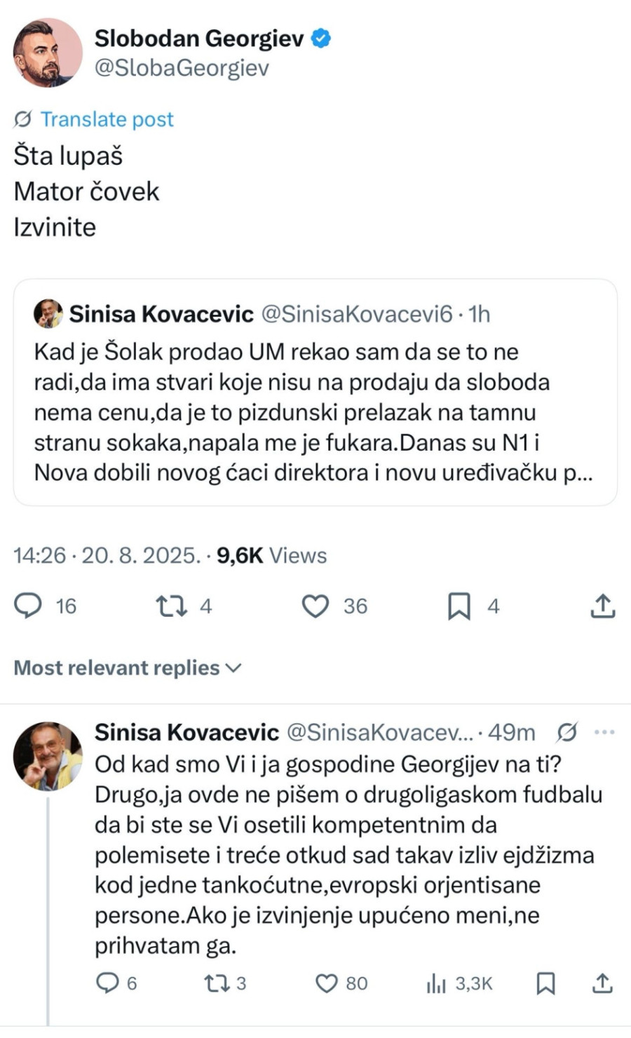 Povodom vesti da je N1 dobila novog direktora, na Tviteru je došlo do spektakularnog obračuna između režimskog dramatičara Siniše Kovačevića i večitog tviteraša Slobodana Georgieva.