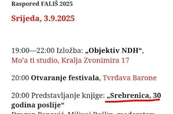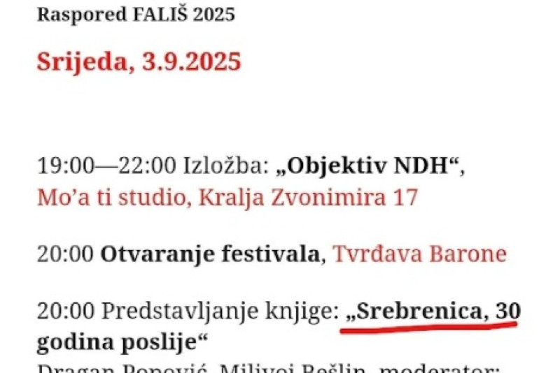 Kako se može videti, Dragan Popović i Milivoj Bešlin, ideolozi opozicije, učestvuju na festivalu "Fališ" u Šibeniku na predstavljanju knjige "Srebrenica: 30 godina posle", naveli su mediji.