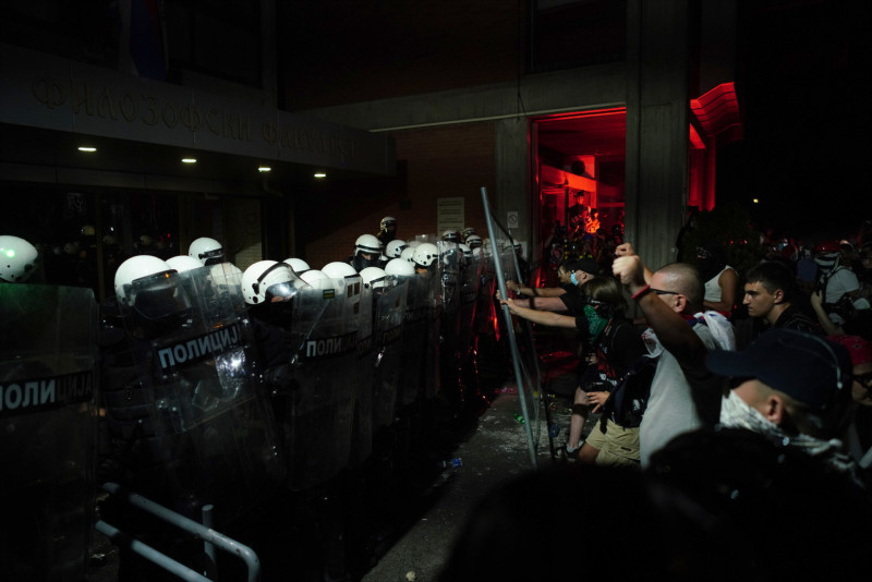Blokaderi su večeras u Novom Sadu na neprijavljenom skupu napali policiju, bacali dimne bombe i topovske udare, ali i pokušali da zapale zgradu Filozofskog fakulteta, pišu mediji.
