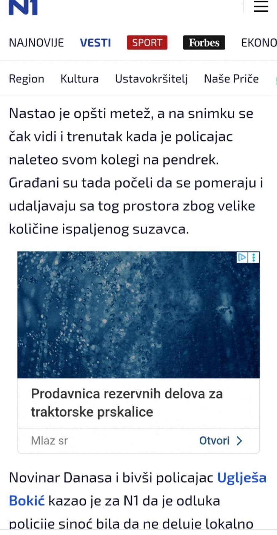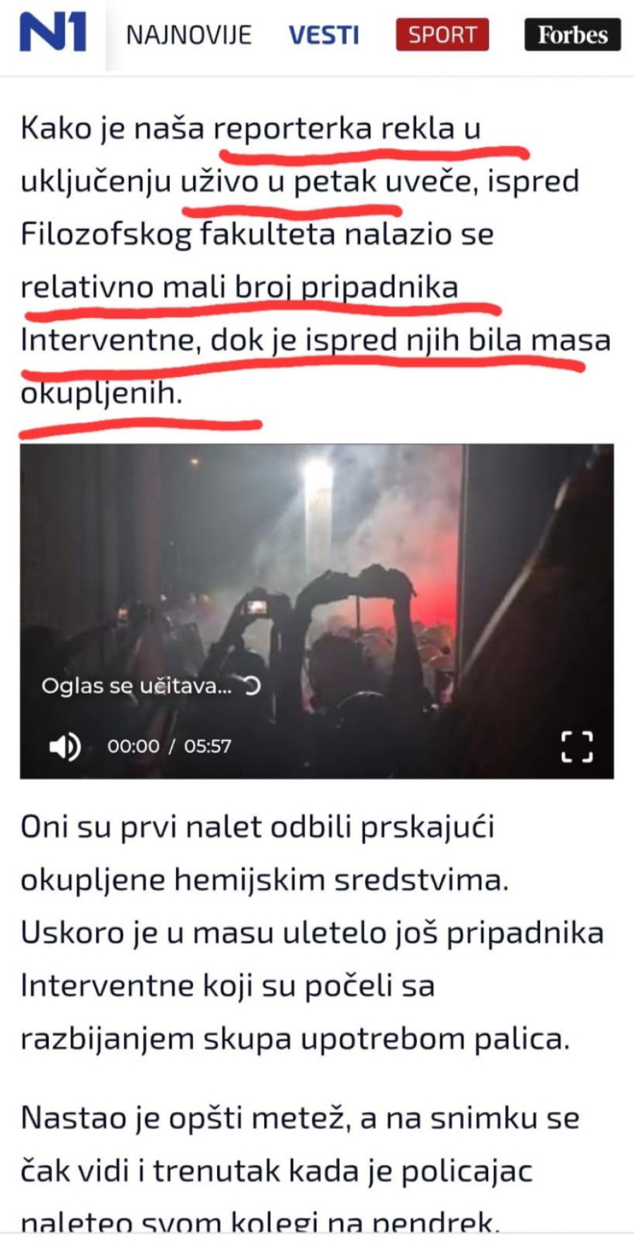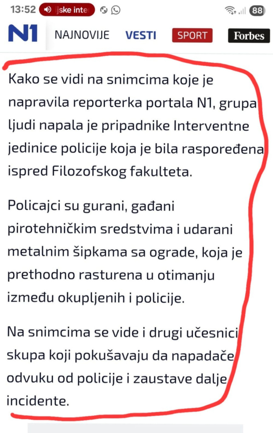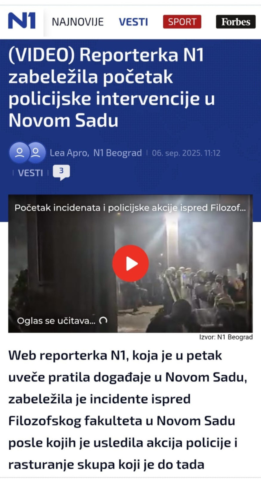 Web reporterka N1, koja je u petak uveče pratila događaje u Novom Sadu, zabeležila je incidente ispred Filozofskog fakulteta u Novom Sadu posle kojih je usledila akcija policije, objavio je N1 u retkom momentu iskrenosti, prenose mediji.