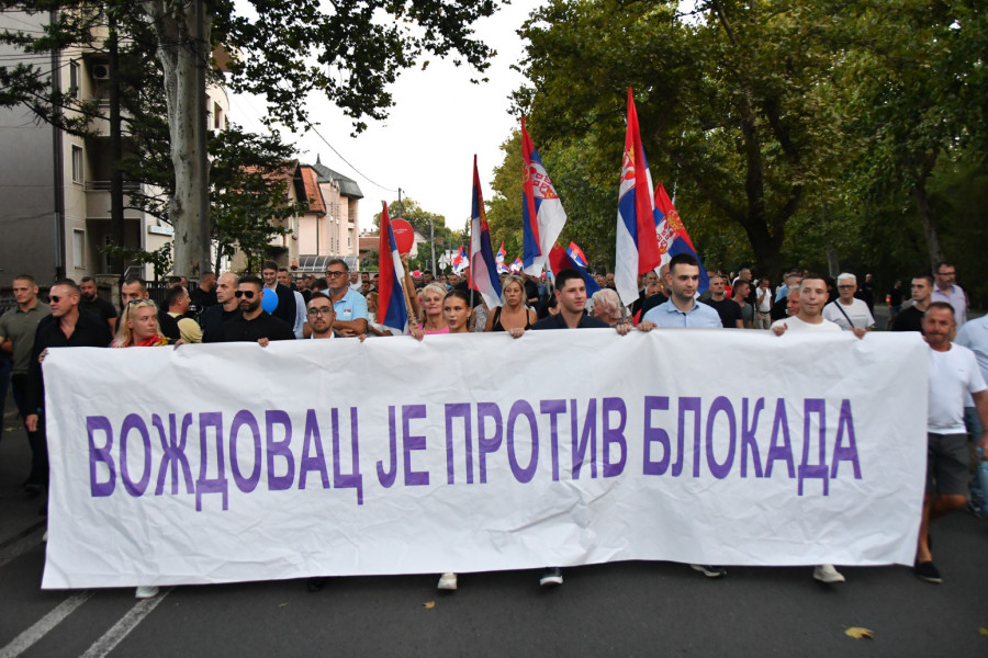 Okupljeni na čelu kolone nose veliki transparent "Srbija je večna dok su joj deca verna" i "Voždovac protiv blokada".