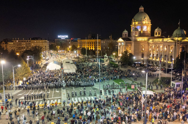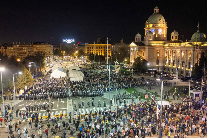 "Poštovani građani Srbije, već neko vreme i po određenim medijima kruže informacije o tome kako se muzika iz Pionirskog parka i sa Trga Nikole Pašića pušta kako bi provocirala bilo koga. U skladu sa tim, mi smo napravili jedno saopštenje nas studenata koji smo protiv blokada i građana koji su protiv blokada i koji žele da se vratimo novom životu", rekao je student Fakulteta političkih nauka Luka Lalošević, prenosi portal 24sedam.rs.