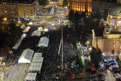 Na platou ispred Doma Narodne skupštine, kao i na Trgu Nikole Pašića prisutan je veliki broj građana koji nose zastave Srbije, kao i transparent "Srbija se pokoriti neće, dok se Vučić po Srbiji kreće", "Srbi sa Kosova i Metohije za Srbiju protiv nasilja".