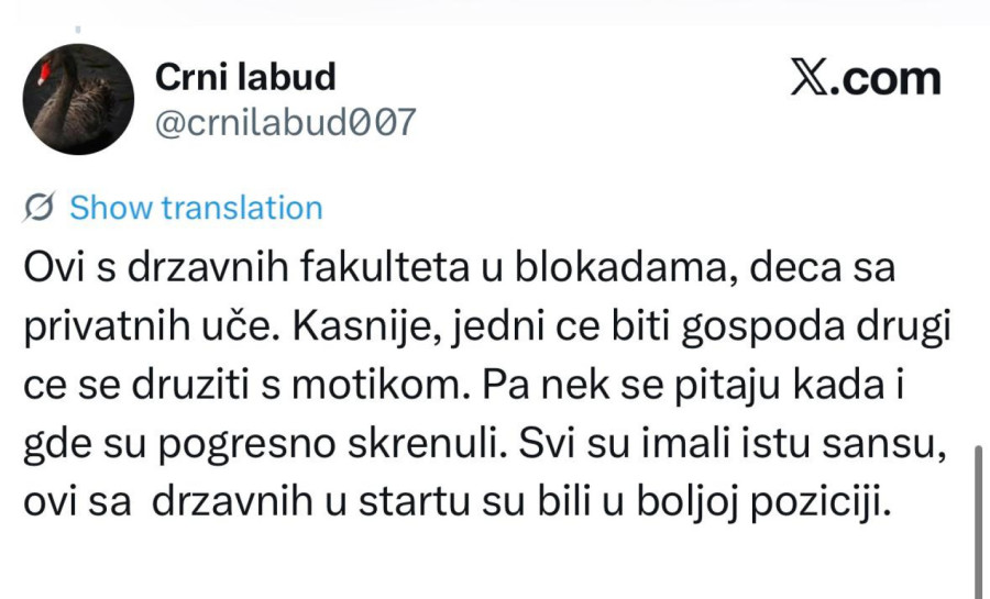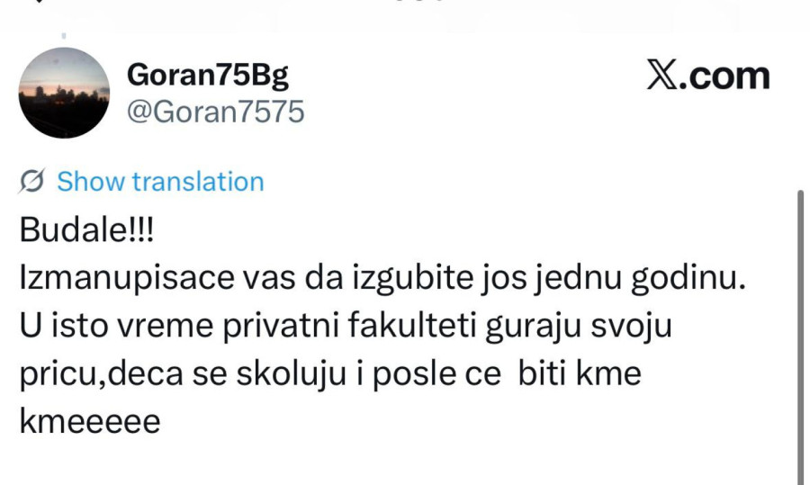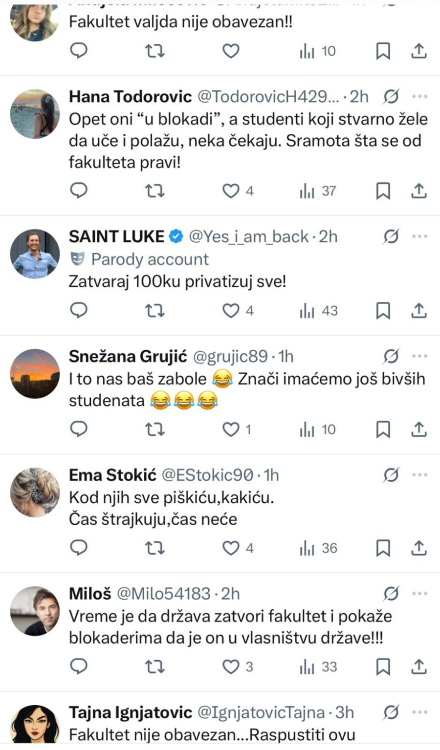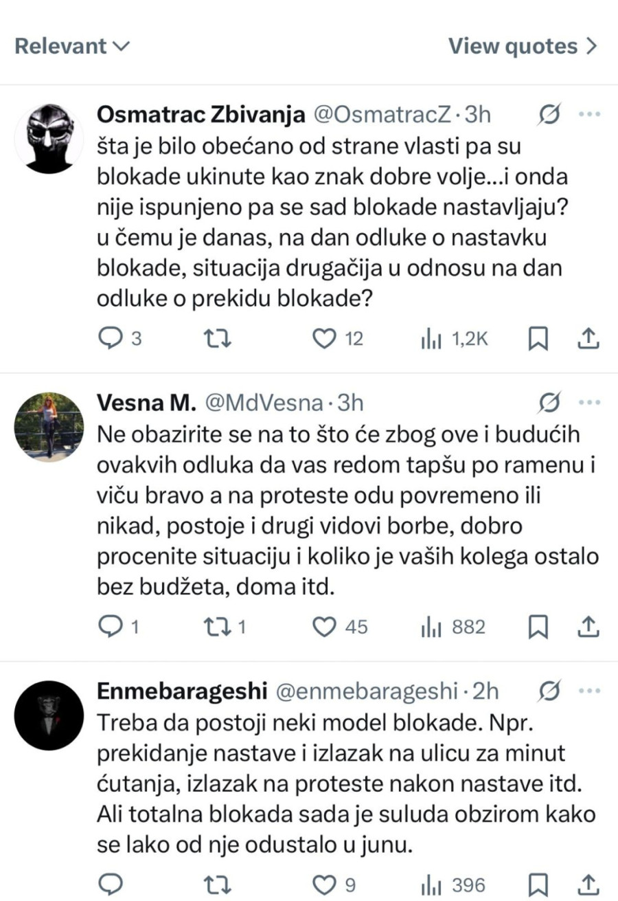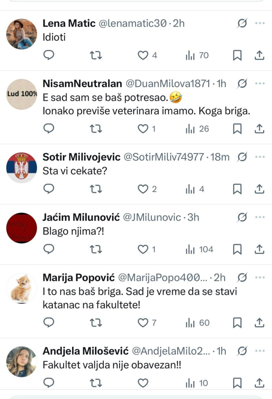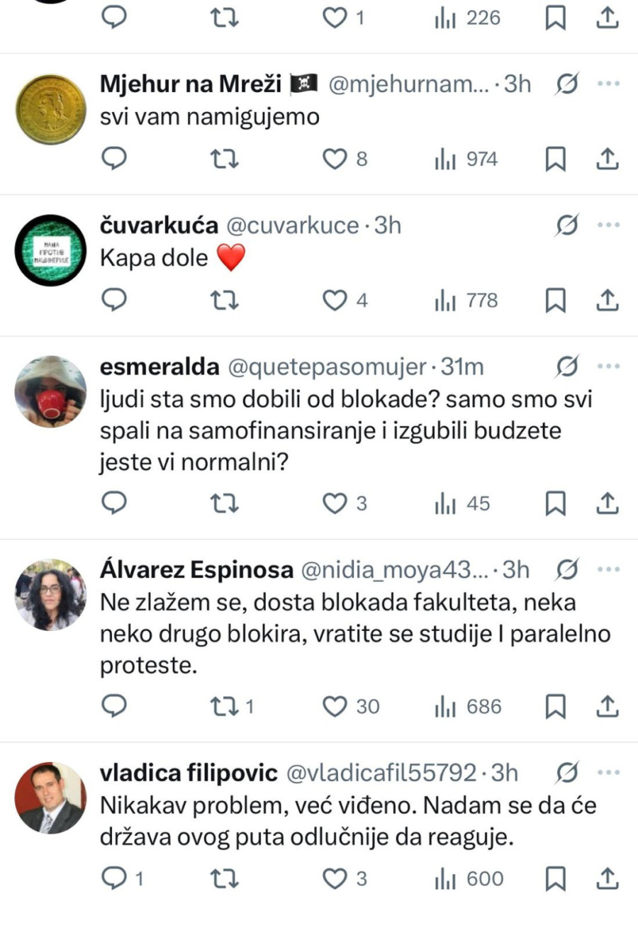 "Ko je ovo izglasao? Profesori? Studenti? Fakultet će raditi, a vi kako hoćete"; "Šta ćemo sada uraditi što nismo za celu prošlu godinu? Blokirati opet do septembra pa polagati 12 ispita za dva meseca. Užasan scenario"; "Šta smo dobili od blokade? Samo smo svi spali na samofinansiranje, izgubili smo budžete. Jeste li normalni?"; "Opet oni u 'blokadi', a studenti koji stvarno žele da uče i polažu neka čekau. Sramota šta se od fakulteta pravi"; "Šta će da se desi? Ništa, sem što će biti problem za studente opet. Pauzirajte godinu ako nemate vremena za proteste"; "Sramota je što smo decu stavili ispred nas da ih žrtvujemo"; "Glupi studenti, slušajte vaše vođe i recite ćao diplomama"; "Izmanipulisaće vas da izgubite još jednu godinu. U isto vreme, privatni fakulteti guraju svoju priču, deca se školuju i posle će biti kme kme", samo su neki od kometara ogorčenih studenata na društvenim mrežama.