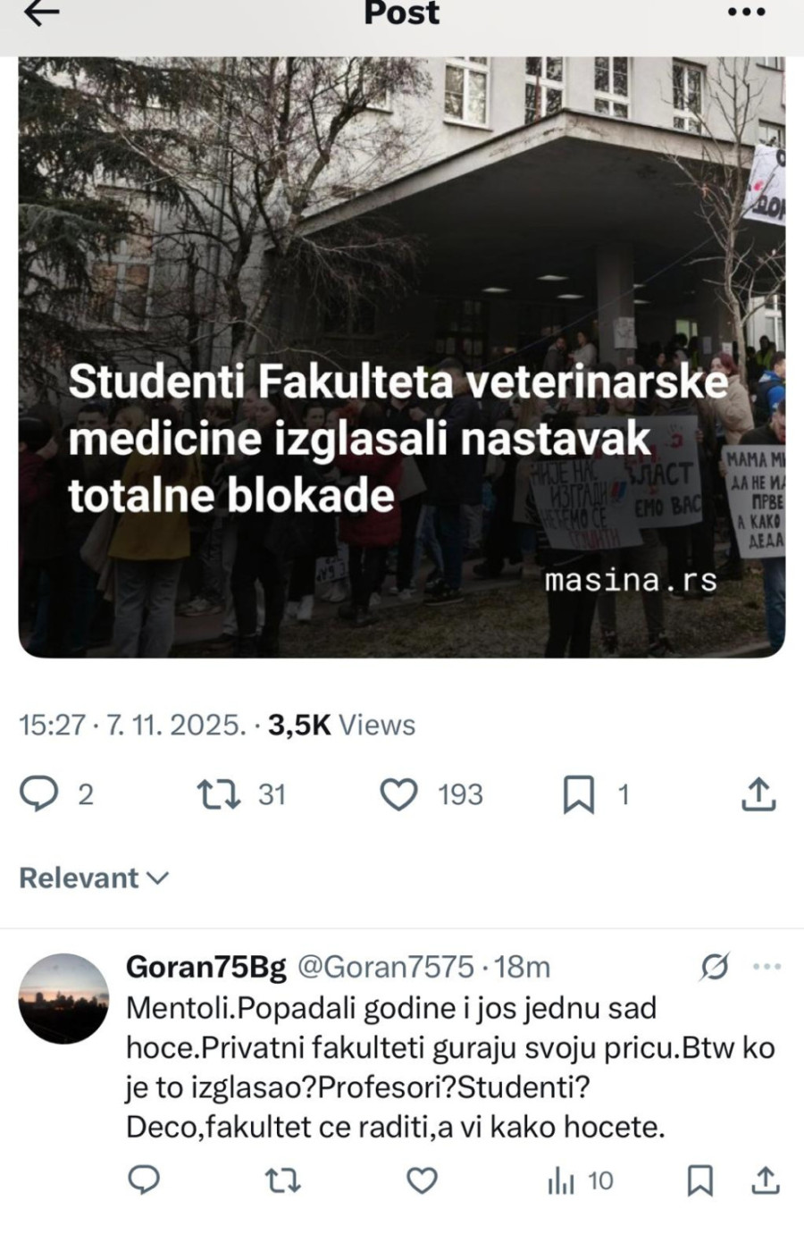 Studenti Fakulteta veterinarske medicine su izglasali nastavak potpune blokade fakulteta, što je izazvalo buru reakcija na društvenim mrežama među onima koji žele da nastave sa studijama i redovno polažu ispite, pišu mediji.