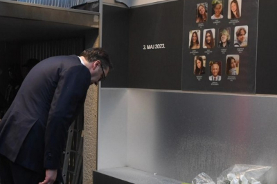 Predsednik Republike Srbije Aleksandar Vučić položio je cveće u školi "Vladislav Ribnikar" na godišnjicu ubistva devet učenika i radnika obezbeđenja ove škole.