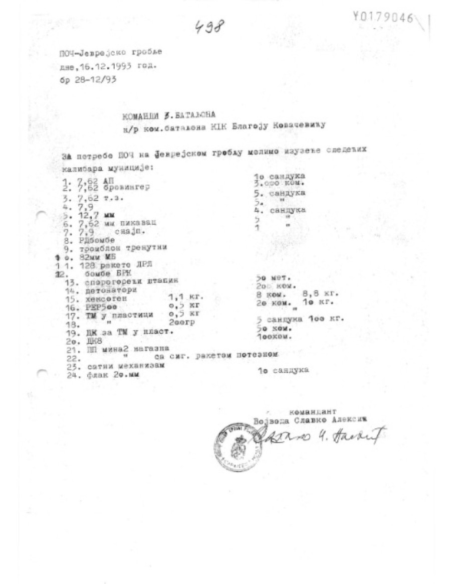 Slavko Aleksić je sve naredbe, odluke, zahteve upućivane prema komandi itd., kao komandant NČO pisao i potpisivao isključivo ćirilicom. Ispod je dokument koji je Aleksić uputio komandi Trećeg pešadijskog bataljona Prve sarajevske motorizirane brigade VRS-a (komandantu Blagoju Kovačeviću) 16. decembra 1993, u kojem traži da se za potrebe jedinice na Jevrejskom groblju osigura municija. Ovaj dokument je korišten na suđenjima Radovanu Karadžiću i Ratku Mladiću u Hagu i na njemu je vidljiv žig Haškog tribunala.