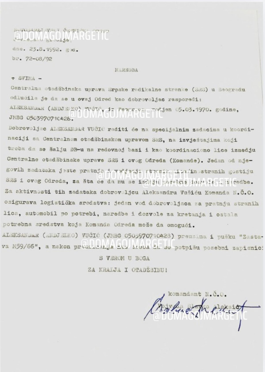 Margetić je do sada objavio nekoliko dokumenata za koje kaže da potiču iz arhive nedavno umrlog četničkog vojvode Slavka Aleksića, bivšeg komandanta Novosarajevskog četničkog odreda (NČO), koji je sa svojim saborcima sa položaja na Jevrejskom groblju godinama terorisao građane opkoljenog Sarajeva. Istraga je detaljno analizirala dokumente koje je objavio Margetić – uporedili smo ih sa dokazano autentičnim dokumentima Novosarajevskog četničkog odreda koji su korišćeni u predmetima na Međunarodnom tribunalu u Hagu i koje je potpisao Slavko Aleksić, kao i sa dokumentima iz drugih izvora koji su ranije javno objavljivani. Analiza nas je nedvosmisleno dovela do zaključka da su dokumenti koje je proteklih dana objavljivao Domagoj Margetić – lažni. U nastavku teksta ćemo to i argumentovati.