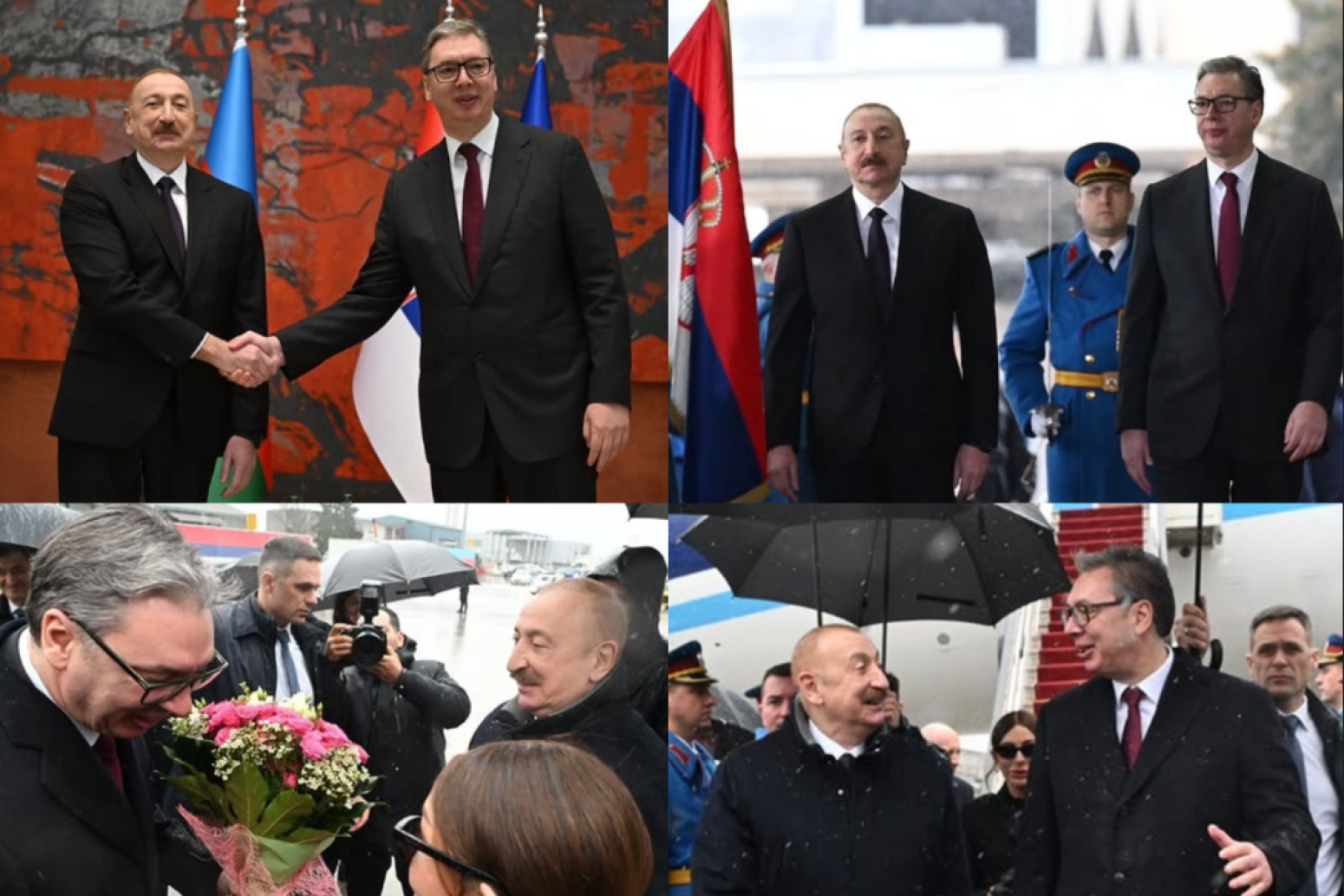 "Naši kineski prijatelji bi rekli da kad je ovakva kiša, to je uvek signal nečeg velikog. Nadam se da lošije vremenske uslove tumačimo na najbolji način i razumemo da je to dobar znak za saradnju Srbije i Azerbejdžana. Želim da iskažem veliko poštovanje prema narodu Azerbejdžana i Vama lično, gospodine predsedniče. Svaki put u razgovoru sa vama mnogo toga naučim, uspem da sagledam iz drugačijeg ugla. Hvala Vam što ste svoje znanje uvek delili sa mnom i što smo uspostavili odnos iz kojeg i moja zemlja ima mnogo toga da dobije", rekao je.