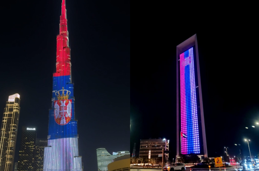 U znak prijateljstva, povodom Dana državnosti, večeras su u bojama srpske zastave osvetljeni Burdž Kalifa u Dubaiju, kao i zgrada ADNOC-a u Abu Dabiju.