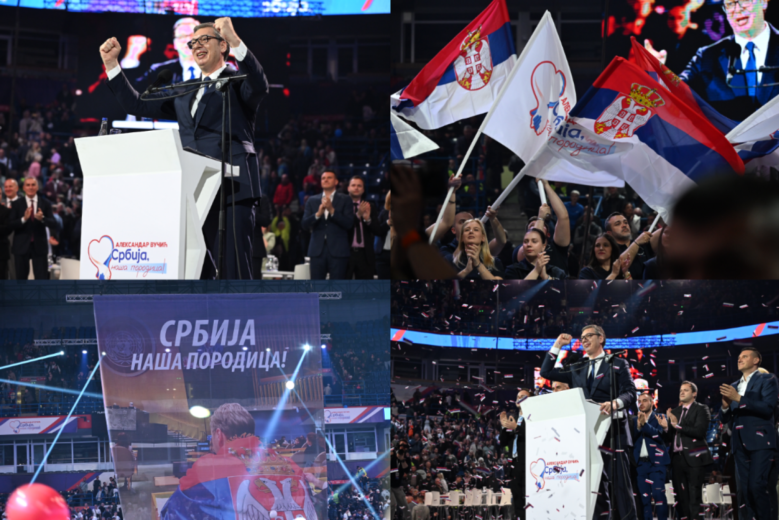 "Teški su bili ovih godinu dana i za mene, ako dozvolite nešto lično da vam saopštim. Sigurno u profesionalnom životu najteži. Svašta su izgovorili, ne o meni, ja to mogu da podnesem, ali ne postoji jeziva stvar koju nisu izgovorili o članovima moje porodice. Većina su ovde večeras, i hvala im što nisu odustali i kada su mi decu terali iz Srbije. Sećam se 15. marta prošle godine kada su nam mnogi koje smo postavljali na funkcije okrenuli leđa. Sećam se svih vas i nikad neću zaboraviti vašu hrabrost, nikoga gađali niste, samo ste im rekli: 'volimo Srbiju, branićemo Srbiju'. Stajali, gledali, i pobedili. Pobeda tek sledi. Godinu dana su nam uzimali živote i rušili Srbiju. Mi njima nećemo, samo ćemo da ih pobedimo. Zato vas pozivam sve da 29. izađete na izbore i da ih pobedimo pošteno", rekao je Vučić.