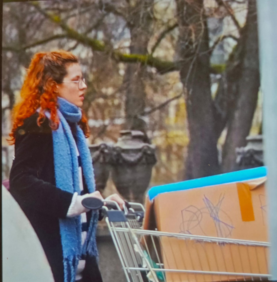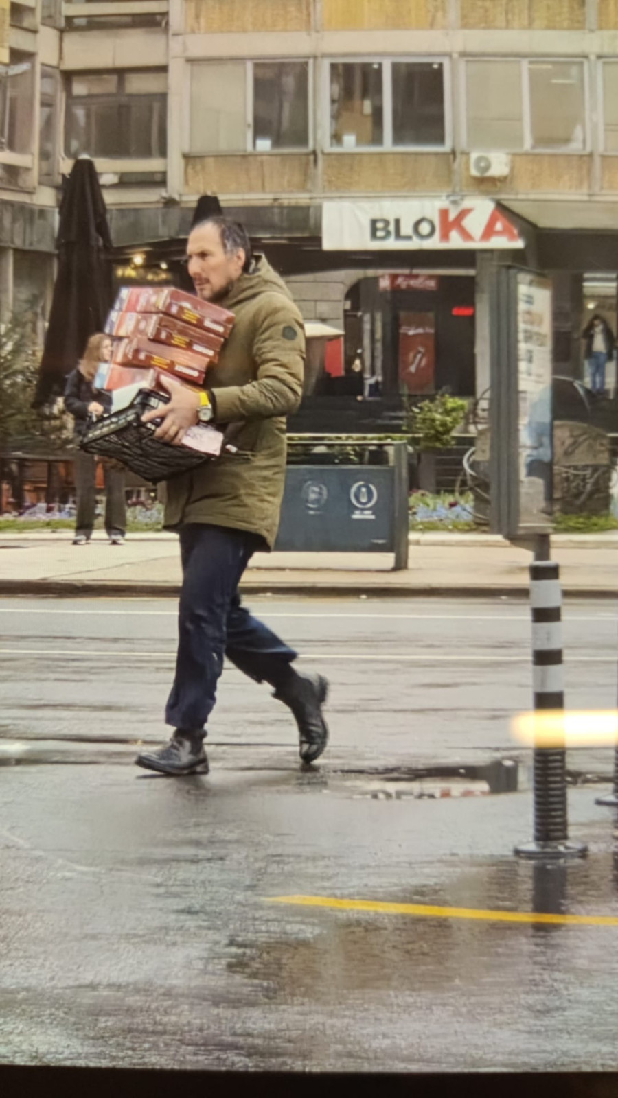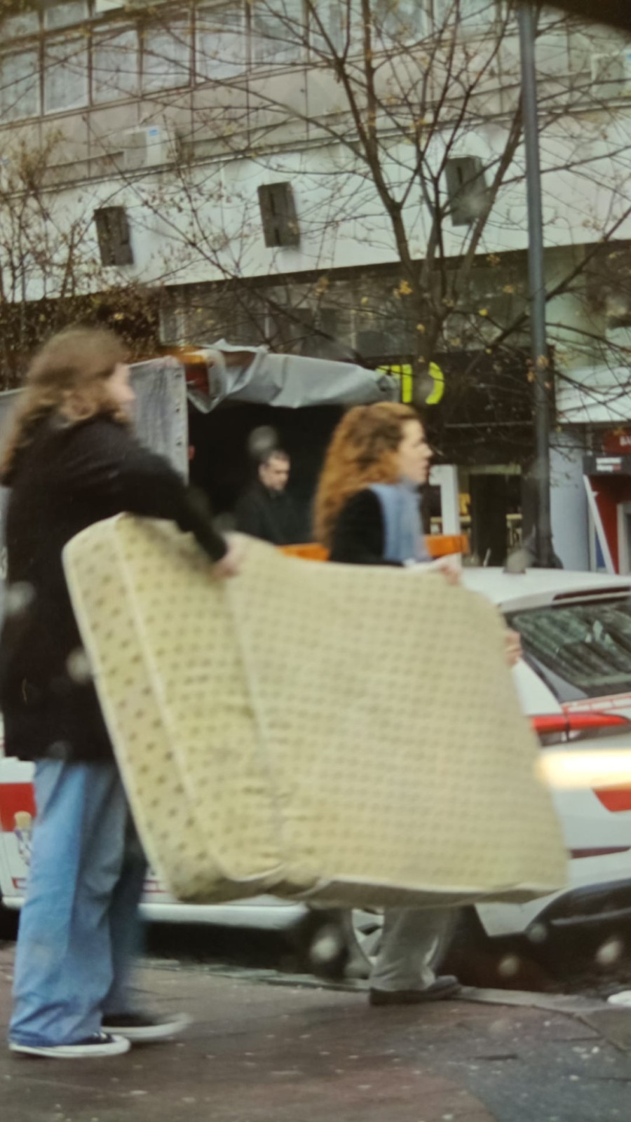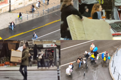 Neke stvari guraju na kolicima, a među stvarima koje iznose iz zgrade su i dušek i ćebad.