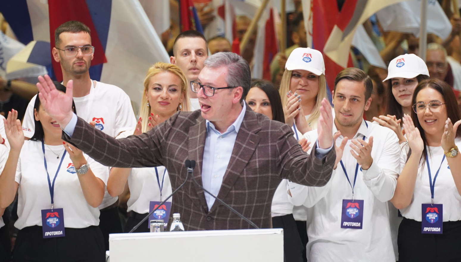 Predsednik Srbije Aleksandar Vučić pozdravljen je aplauzom, a na početku obraćanja rekao je da misli da su izbori 2. juna od ogromnog značaja.