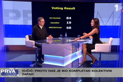 "Oni su gurali tu rezoluciju. Mi smo se suočili sa najtežom temom. Protiv nas je to kao "savršena oluja", jer je protiv nas bio kompletan kolektivni zapad - dakle EU plus ovi što nisu EU, a kao da jesu i još jači zaštitnici prekookeanskih interesa - Švajcarska, Norveška, San Marino, imali ste Ameriku, Kanadu, Australiju, Novi Zeland, kosponzore koje su najčešće primoravali, a neki su se sami javili, jer su želeli da kažu da imaju podršku od svuda. Očekivali su da će to biti gotovo jednoglasno doneto. Računali su da ako je Rusija imala 7 glasova, da bismo mi mogli eventualno da imamo 8 glasova protiv i 20, 25 do 40 da bude ukupno onih koji su uzdržali ili protiv. Računali su da je to rutinski i da će time još jednom pokazati da mogu da pobede Rusiju", rekao je Vučić za TV Prva i dodao: