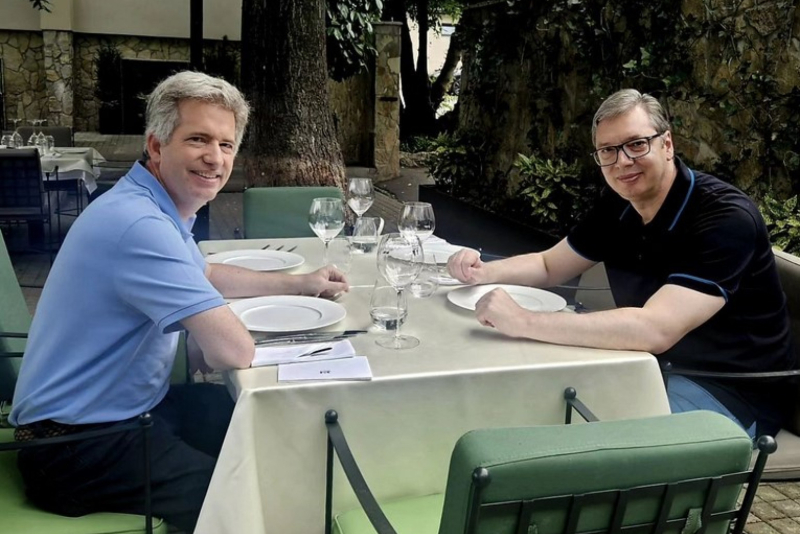 "Dobar razgovor sa Njegovom ekselencijom ambasadorom Ujedinjenog Kraljevstva Edvardom Fergusonom o svim važnim pitanjima za Srbiju i UK. Danas ja plaćam ručak, a Njegova ekselencija, pošto ćemo danas da ih pobedimo u Gelzenkirhenu, plaća sledeću večeru. Srećno Orlovi", napisao je Vučić uz fotografiju na svom Instagram profilu.