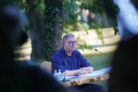 "Ne govorite vi ovde ni o Ani Brnabić, Dubravki, Vučeviću, ovde vam smetam ja. To je sve naredio jedan tajkun, kriminalac, Dragan Šolak, kojem sam se suprotstavio u želji da upravlja ovom zemljom. Ponosan sam na tu činjenicu što sam ja taj čovek, što se ne plašim njegovih veza ni u CIA, ni gde hoćete. 12 godina sam posvetio teškog i napornog rada. Nisam u tih 12 proveo ni jedan godišnji odmor u celini. Nisam bio dobar roditelj svojoj odrasloj deci, oni su moji sin i ćerka, nisam im bio dobar roditelj u tih 12 godina, nisam bio dobar roditelj ni trećem detetu, vreme je da razmišljam o tome šta ću drugo. Ovo vam je moja ponuda, nemojte da se maltretirate da gubite vreme, 75 potpisa donesite, obezbediću vam ja ostatak potpisa, idemo pre kraja godine na referendum o opozivu predsednika. Ja ću da se borim protiv vas i tad. Nemojte da zaluđujete narod, vi to radite zbog mene. Hoćete meni da vidite leđa. Skupite samo, ima vas toliko, skupite 70, daćemo sve što vam je potrebno za dve trećine. Treba samo 50 odsto sve zajedno da skupite ko sad što ste skupili i s koca i konopca. Nikakav problem nije. I više nisam predsednik, neću ni da čekam kraj mandata," rekao je.