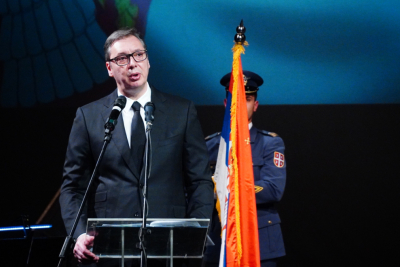 "Mnogo ste veliki i jaki, mi smo mali, ali tvrdi i čvrsti i snažni da vam nikada ne popustimo, da čast i obraz ne ukaljamo, i da znamo da je sloboda najveća vrednost od svega," poručio je Vučić.