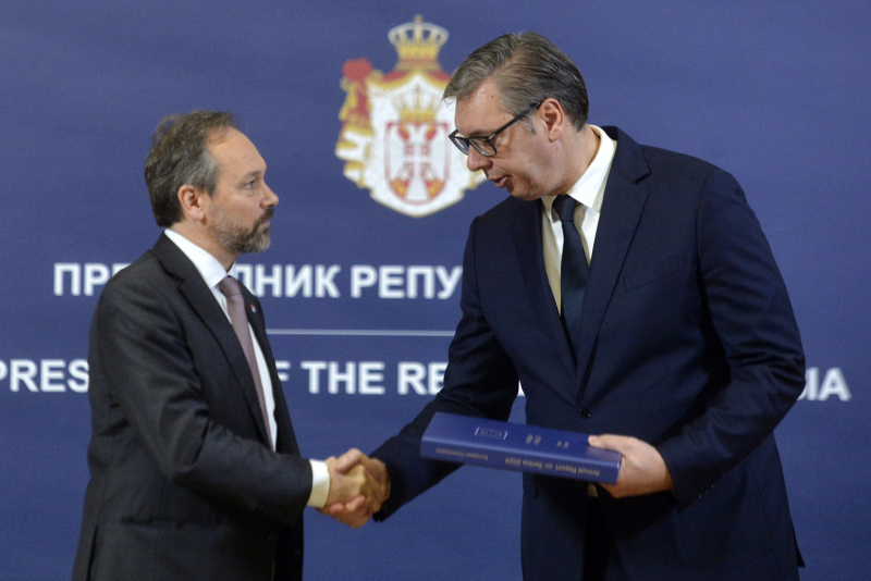 "Drugačije vidimo i neke druge stvari i pogled na izbore i neka pravila, drugačije vidimo, jer se Srbiji postavlja nešto što se ne postavlja nigde drugo u svetu, ali i to smo razumeli i pokušaćemo da izađemo u susret i preporukama ODIHR-a, ali i onima koji nisu dovoljno dobri i misle da na vlast ne dolaze ne zato što ih narod neće, nego zato što nedostaju neka pravila", rekao je Vučić tokom zajedničkog obraćanja sa šefom Delegacije EU u Srbiji Emanuelom Žiofreom, a nakon što mu je predao Izveštaj Evropske komisije o Srbiji za 2024. godinu.