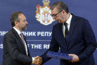 Predsednik Srbije Aleksandar Vučić, nakon razgovora sa šefom Delegacije EU u Srbiji Emanuelom Žiofreom, obraća se medijima. S njim se obraća i Žiofre.