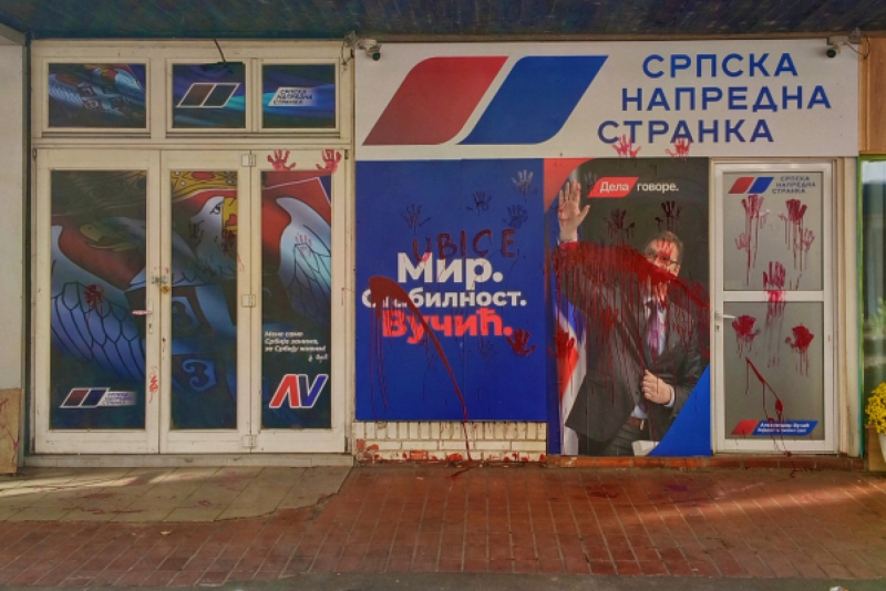 "Oštećena vrata, išaran crvenom farbom deo trotoara i pano sa stranačkim oznakama - posledica su ideologije mržnje i nasilja kojom nas opozicija obasipa kroz razne lažne "mirne performanse", a čiji je jedini cilj nasilno rušenje vlasti. Ovaj čin je još jedan u nizu pokazatelja da opozicija koristi nasilje kao jedinu metodu svoje političke borbe, budući da su svesni da nemaju podršku naroda. Opozicioni lešinari su ovim činom pokazali da njih zapravo žrtve, ma koje nesreće, zanimaju samo zarad političke koristi kroz izazivanje nemira i nasilja", ističe se u saopštenju.