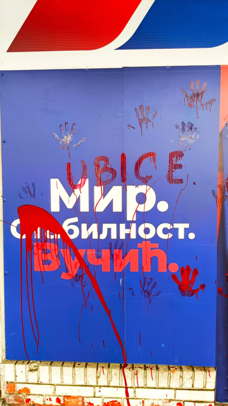Monstruozna poruka "ubice" ostavljena je ispod plakata sa likovima predsednika Srbije Aleksandra Vučića i premijera Miloša Vučevića.