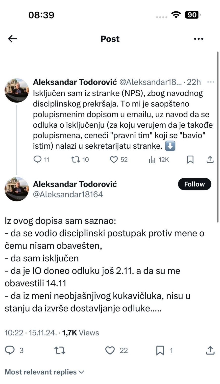 Dojučerašnji predsednik Nadzornog odbora i sekretar svih resornih odbora Aleksićeve stranke, Aleksandar Todorović, na mreži Iks optužio je Aleksića koji ga je izbacio iz stranke obaveštavajući ga o tome u "polupismenom mejlu, kukavički", prenose Novosti.