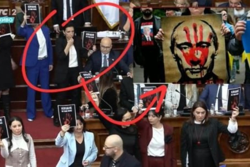 U pitanju su transparenti sa krvavom šakom i sloganom "Putin ubica", što je slična parola koju je i opozicija danas u Skupštini izgovarala - "ubice".