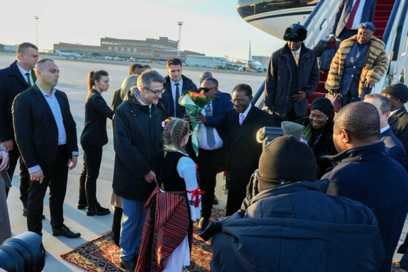 Na video snimku dočeka vidi se da su predsedniku Ekvatorijalne Gvineje i njegovoj supruzi deca odevena u narodnu nošnju poklonila cveće.