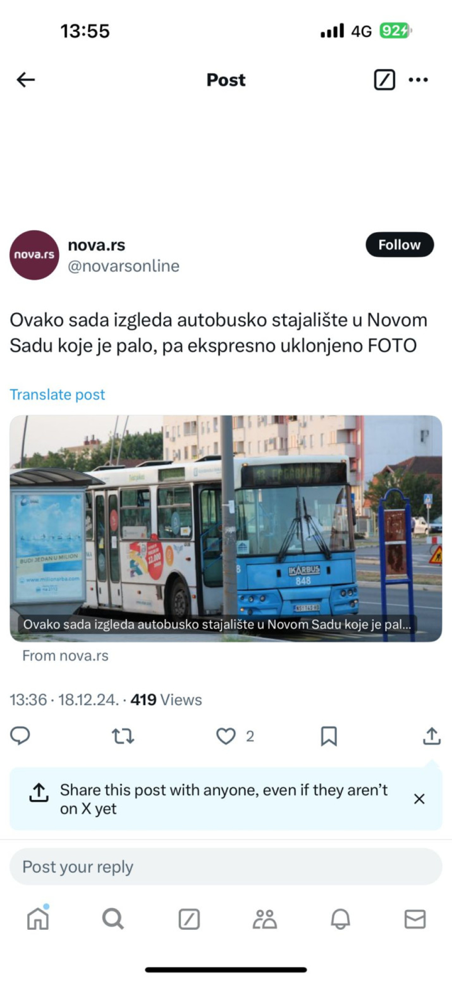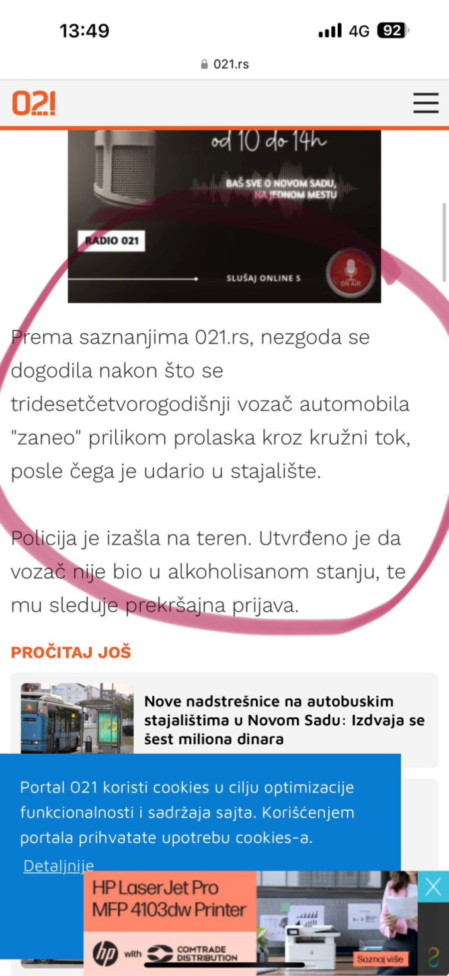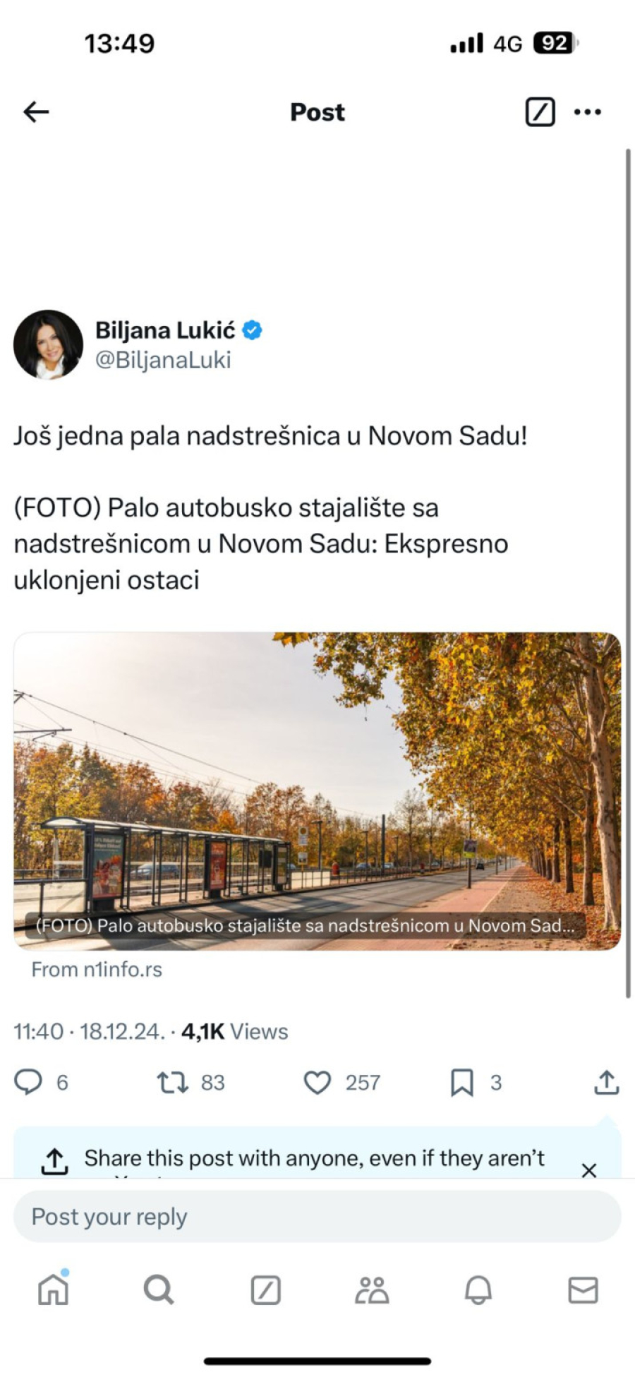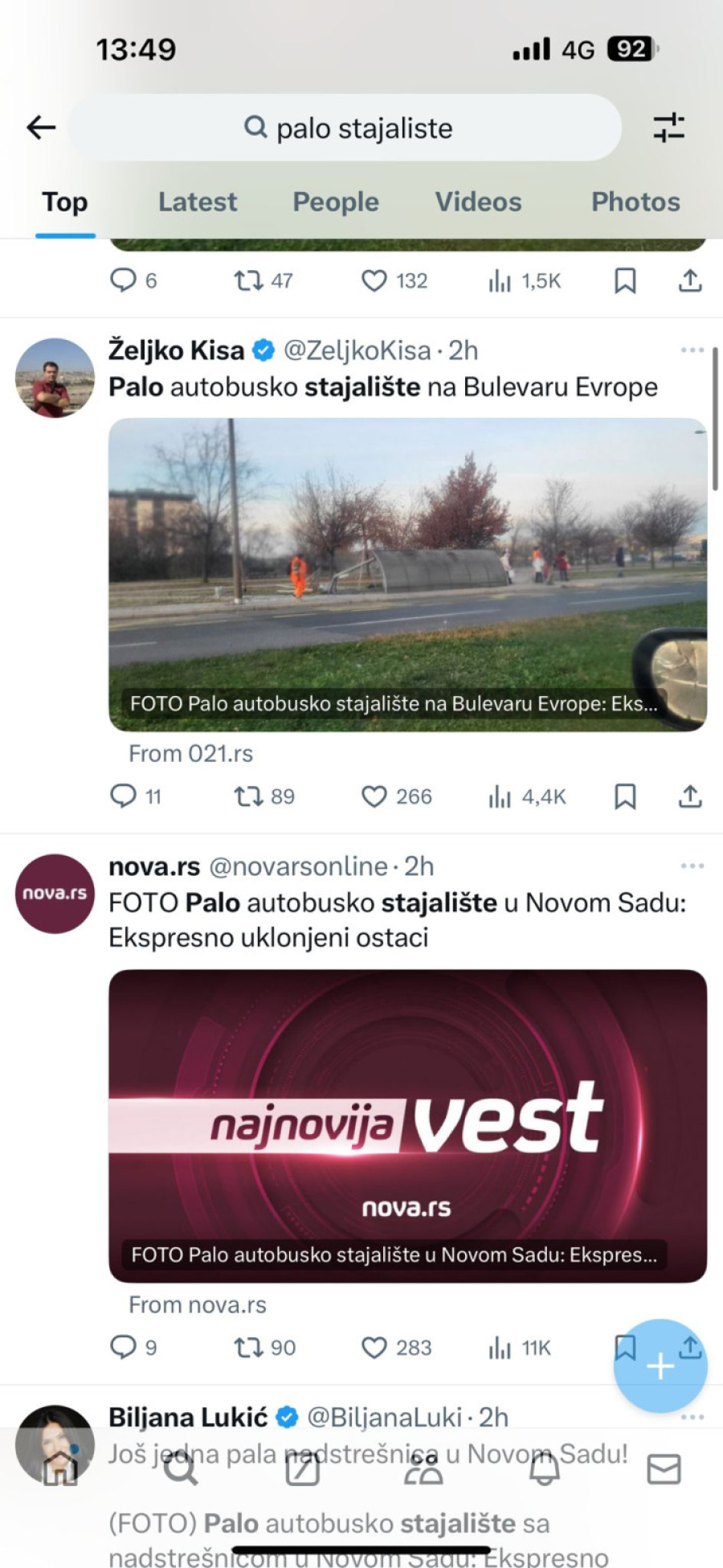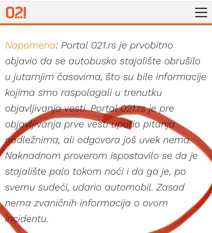 Mediji Dragana Đilasa i Biljana Lukić preneli informaciju da se srušilo autobusko stajalište u Novom Sadu, ali, izostavili da napomenu da se stajalište srušilo jer je u njega udario automobil prilikom saobraćajne nezgode.