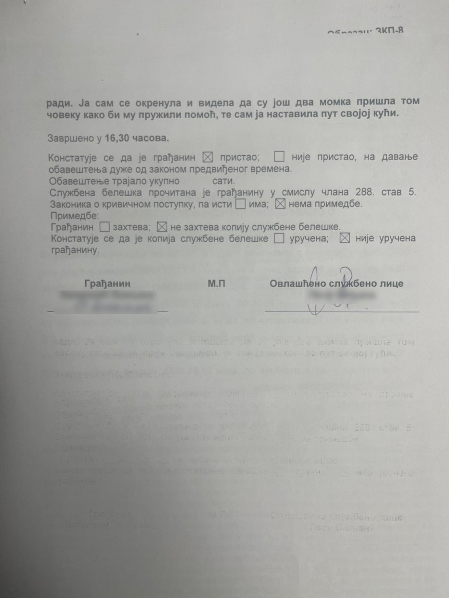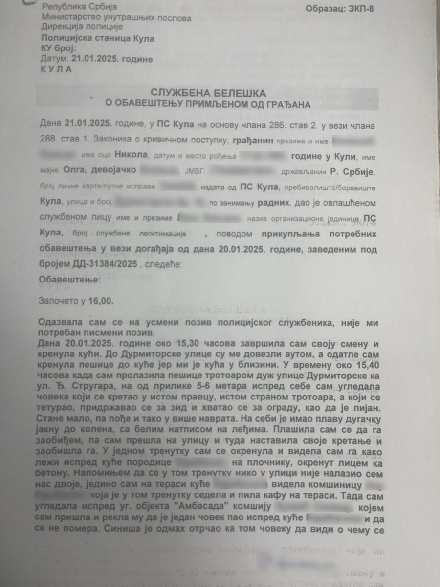 "U vremenu oko 15:40 časova kada sam prolazila pešice trotoarom duž ulice Durmitorske ka ulici Đ. Strugara, na od prilike 5-6 metara ispred sebe sam ugledala čoveka koji se kretao u istom pravcu, istom stranom trotoara , a koji se teturao, pridržavao se za zid i hvatao za ogradu, kao da je pijan. Stane malo, pa pođe, i tako u više navrata... Plašila sam se da ga zaobiđem, pa sam prešla na ulicu i tuda nastavila kretanje i obišla ga. U jednom trenutku sam se okrenula i videla sam ga kako leži ispred kuće porodice (prezime koje je rečeno u zapisniku poznato redakciji), na pločniku, okrenut licem ka betonu", ispričala je žena koja je bila svedok ove nemile scene.