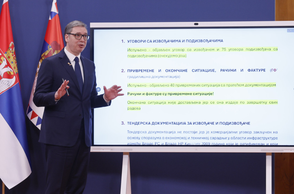 "Ovo su tražili predstavnici Građevinskog fakulteta, klasifikovano u saradnji sa studentima, u 24 tačke, dodatne 24 tačke. Za nas je strašno važno da budemo transparentni, i da vidite da smo sve dali, da ne slušate prazne priče kako negde neko nešto ne daje, falsifikuje, da svakome bude jasno da smo mi uradili svoj posao. Prvo, ne razumem zašto Vlada odmah nije objavila osnovni ugovor. Zato sam rekao predsedniku Vlade da je potrebna hitna rekonstrukcija. Uopšte nije bilo oznake tajnosti ili poverljivosti na tom ugovoru. Danas je objavljen u potpunosti i 75 ugovora sa podizvođačima, mislimo da ih ima 72 biće objavljena najkasnije prekosutra ujutru, zato što to nije bio deo spisa predmeta. Tek sada policija je otišla kod svih podizvođača, upala i uzela svu dokumentaciju, ostalo je još 7 ugovora podizvođača sa podizvođačima. Sve glavno je objavljeno", rekao je Vučić i dodao: