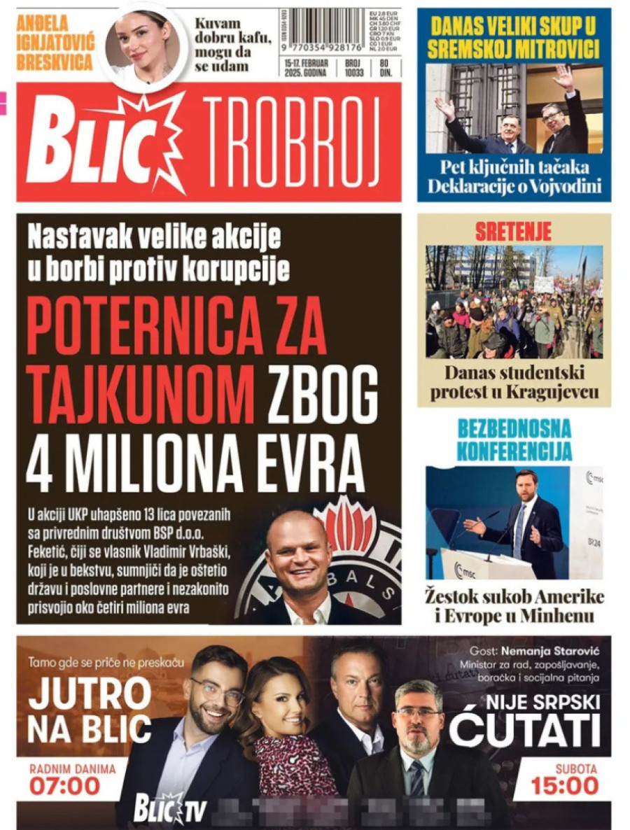 Dnevne novine u Srbiji za praznik su štampale trojbroj, 15. 16. i 17. februar 2025. godine, na naslovnim stranama najavljuju brojne aktuelne društveno-političke teme i donose ekskluzivne priče.