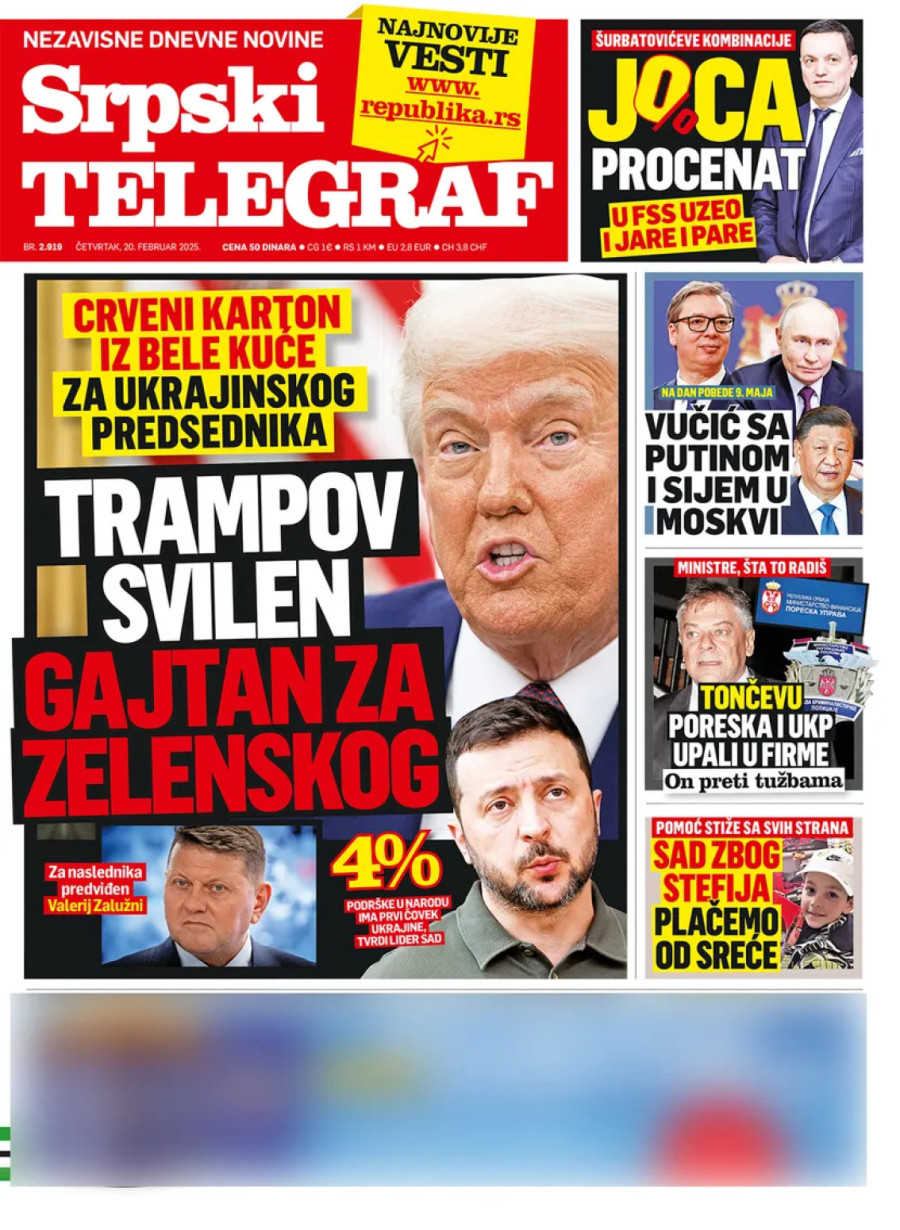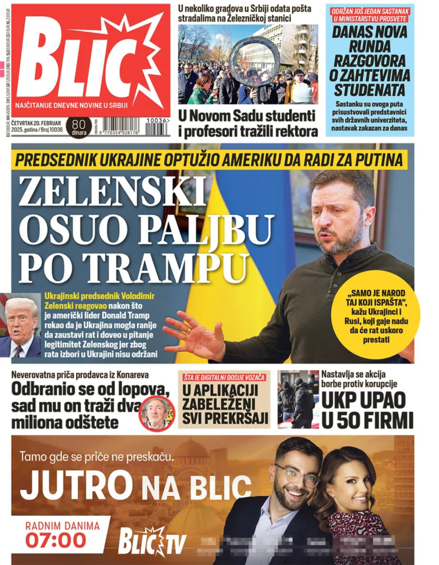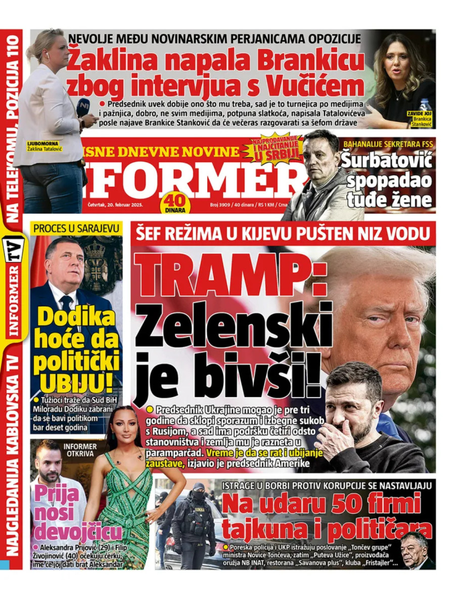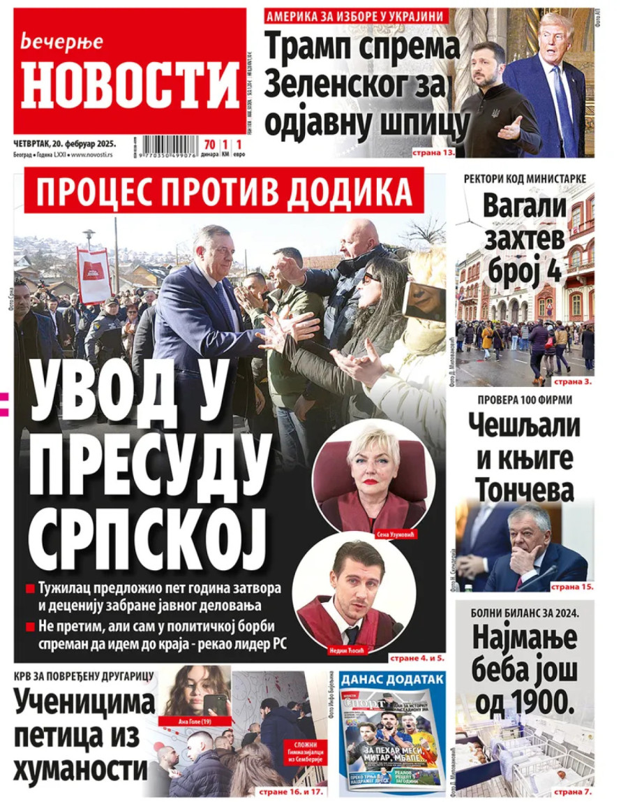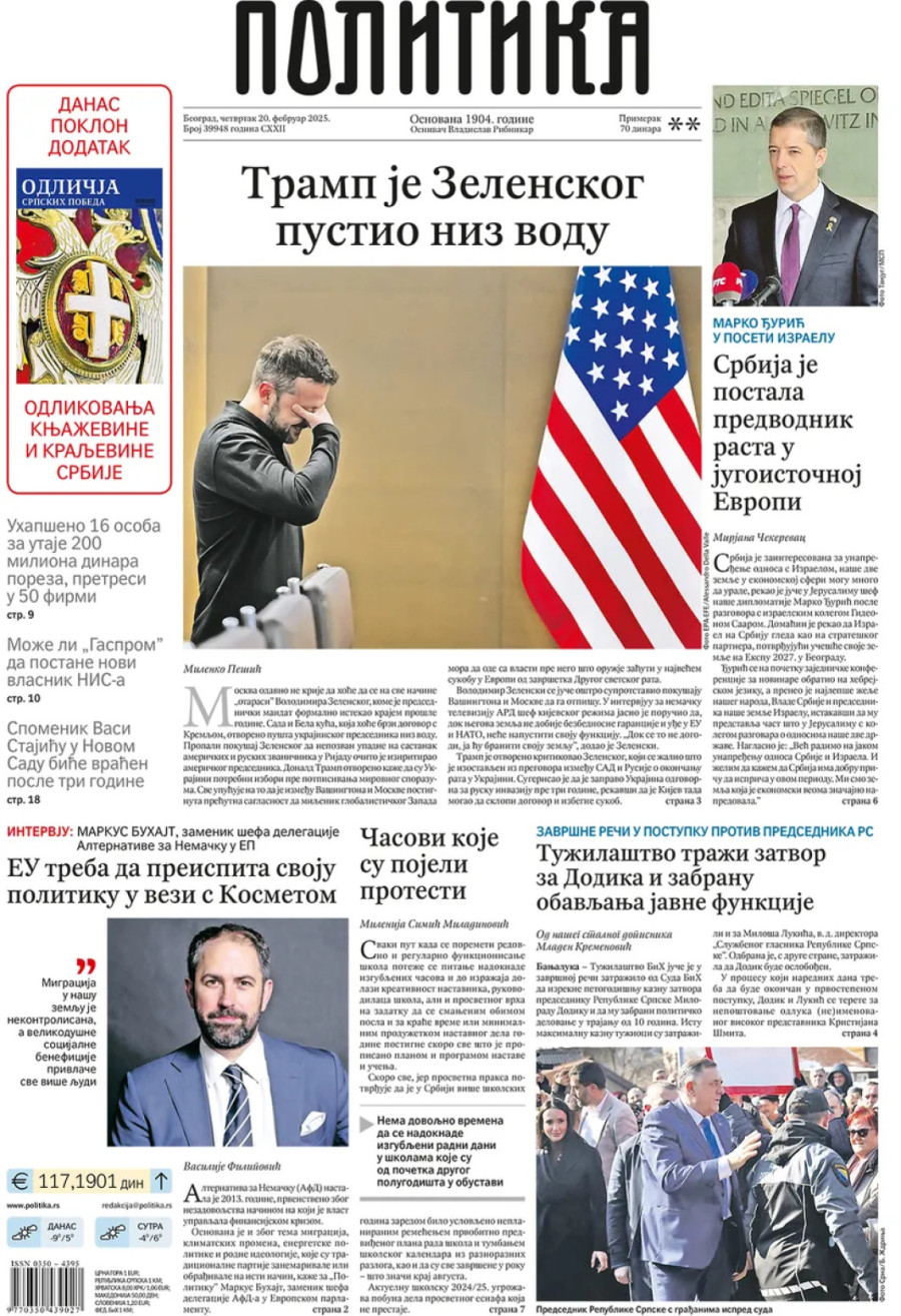 Dnevne novine u Srbiji za 20. februar 2025. godine, na naslovnim stranama najavljuju brojne aktuelne društveno-političke teme i donose ekskluzivne priče.