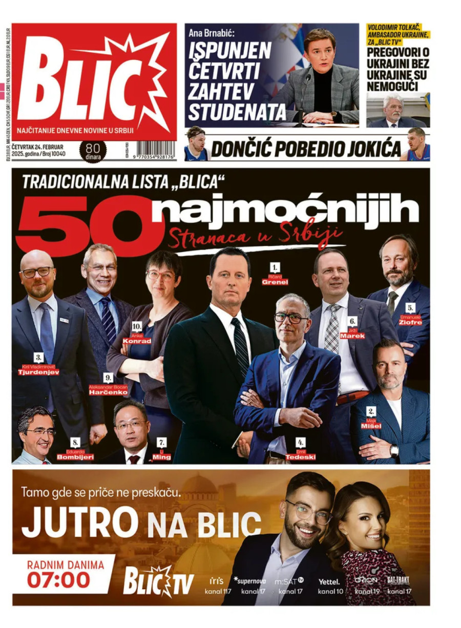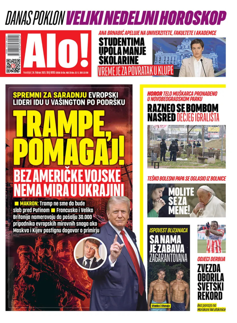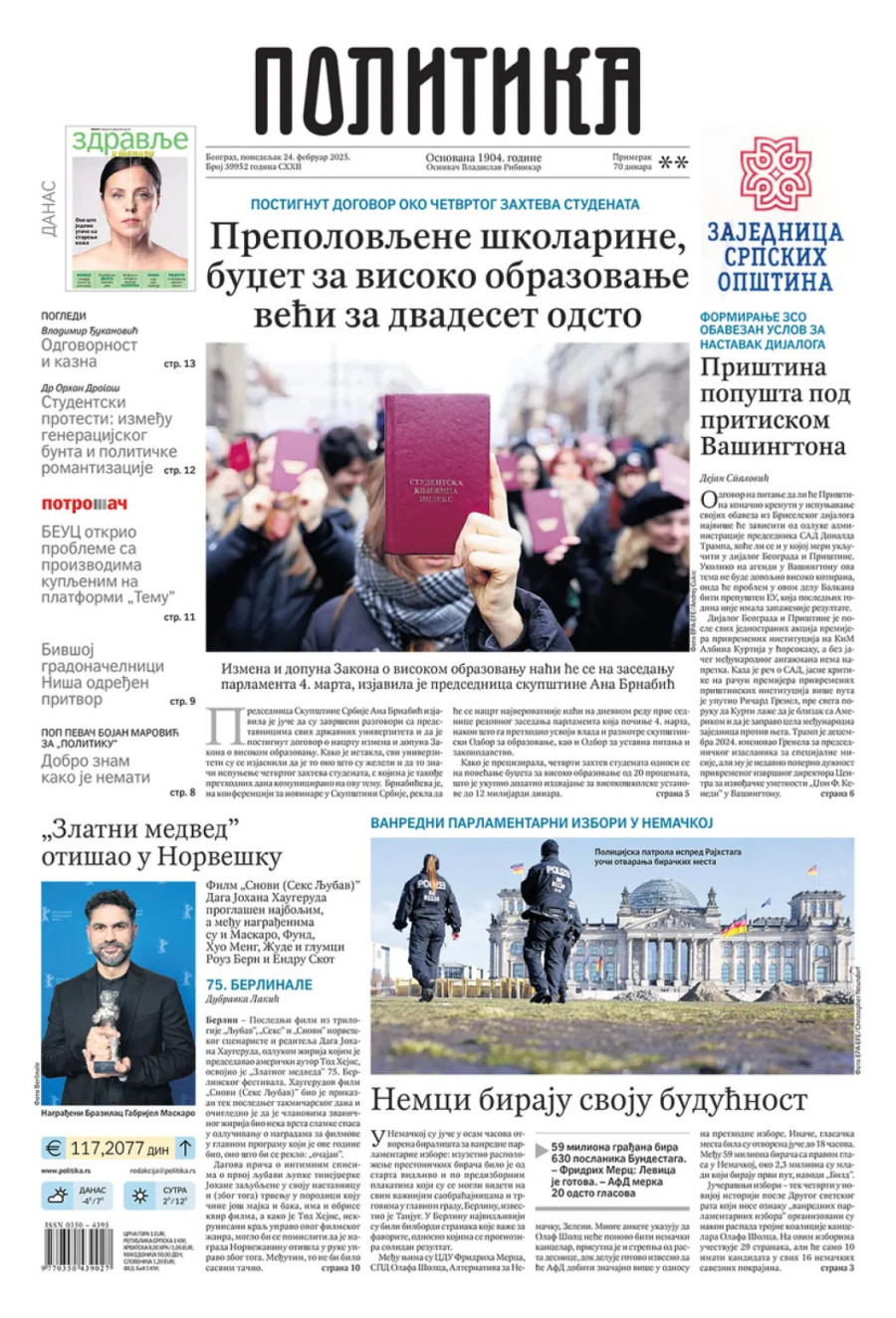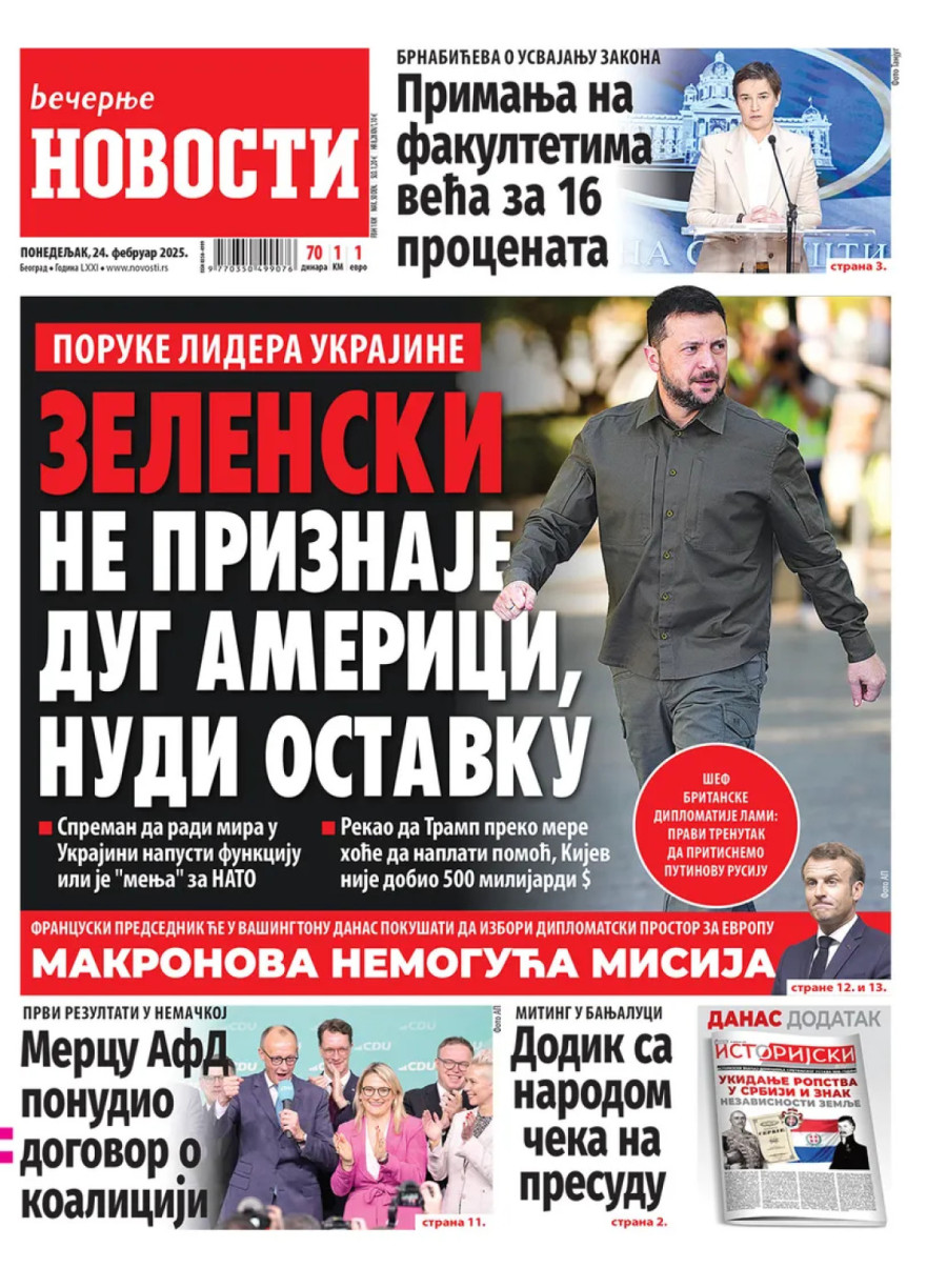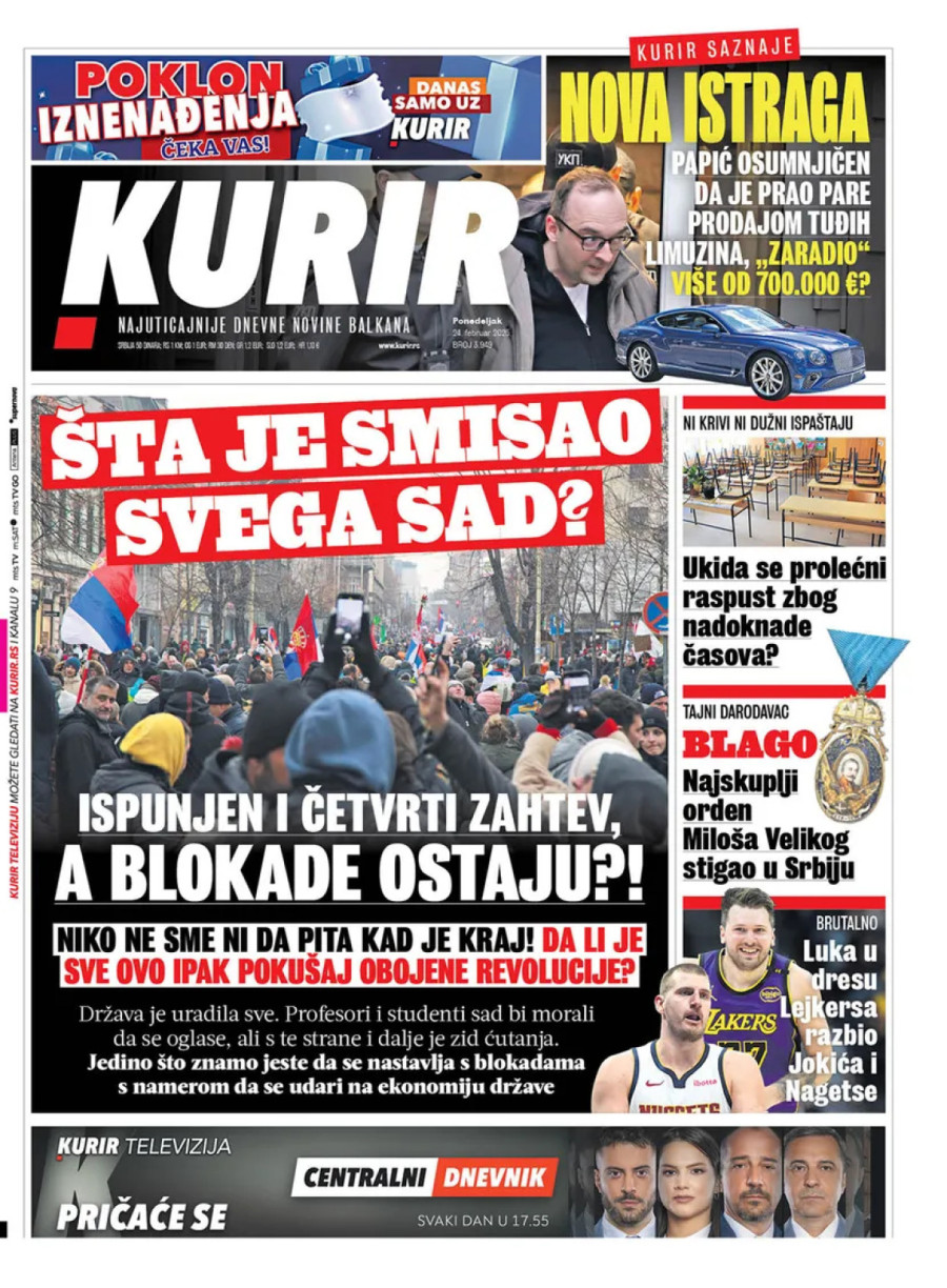 Dnevne novine u Srbiji za ponedeljak, 24. februar 2025. godine, na naslovnim stranama najavljuju brojne aktuelne društveno-političke teme i donose ekskluzivne priče.