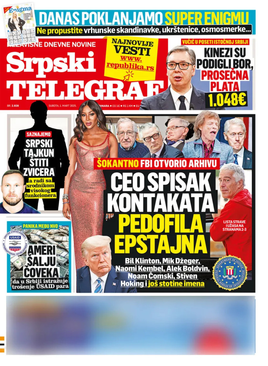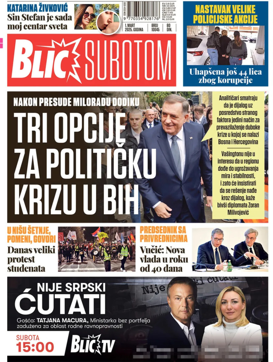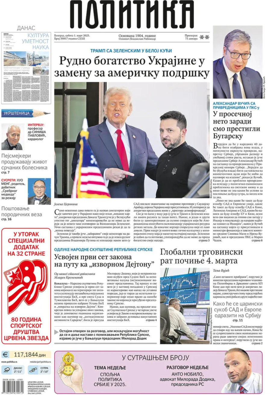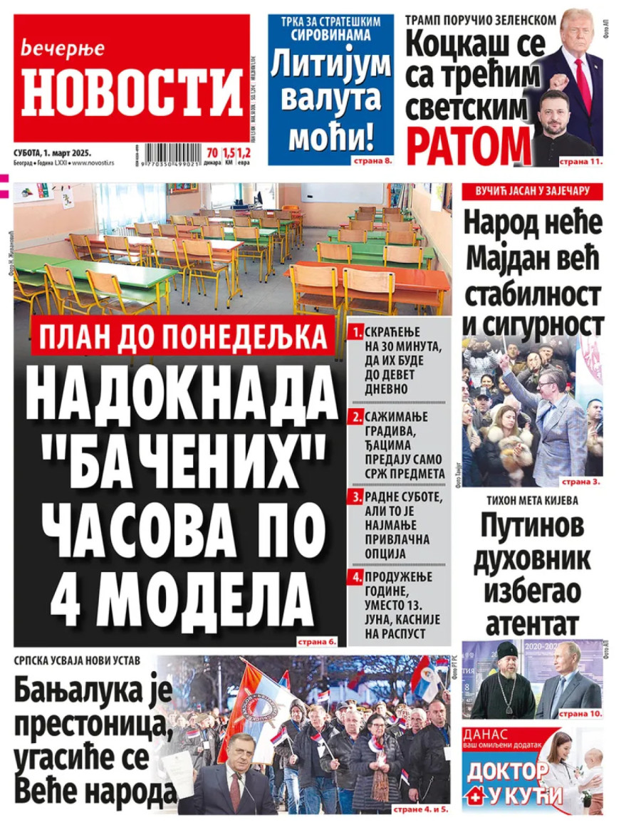 Dnevne novine u Srbiji za petak, 1. mart 2025. godine, na naslovnim stranama najavljuju brojne aktuelne društveno-političke teme i donose ekskluzivne priče.