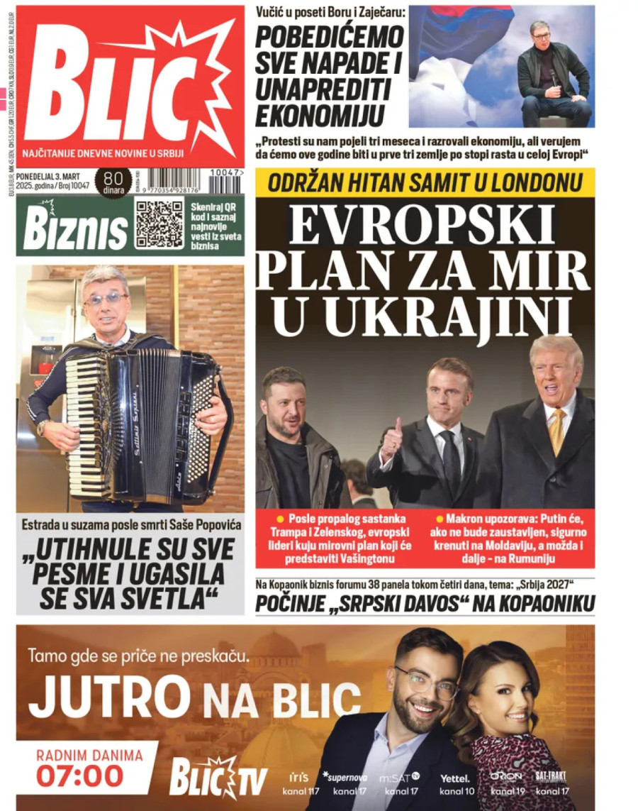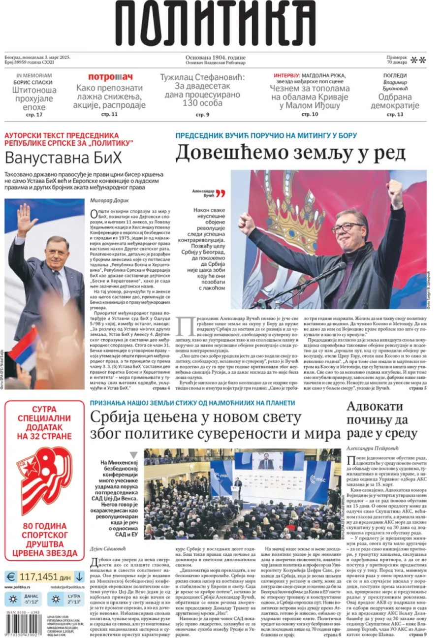 Dnevne novine u Srbiji za ponedeljak, 3. mart 2025. godine, na naslovnim stranama najavljuju brojne aktuelne društveno-političke teme i donose ekskluzivne priče.