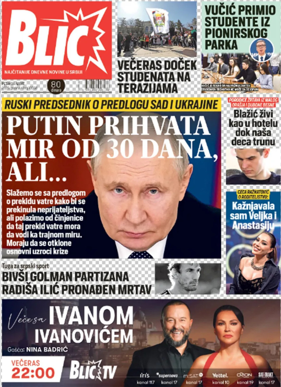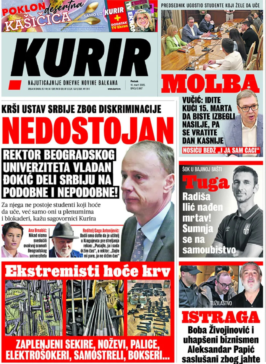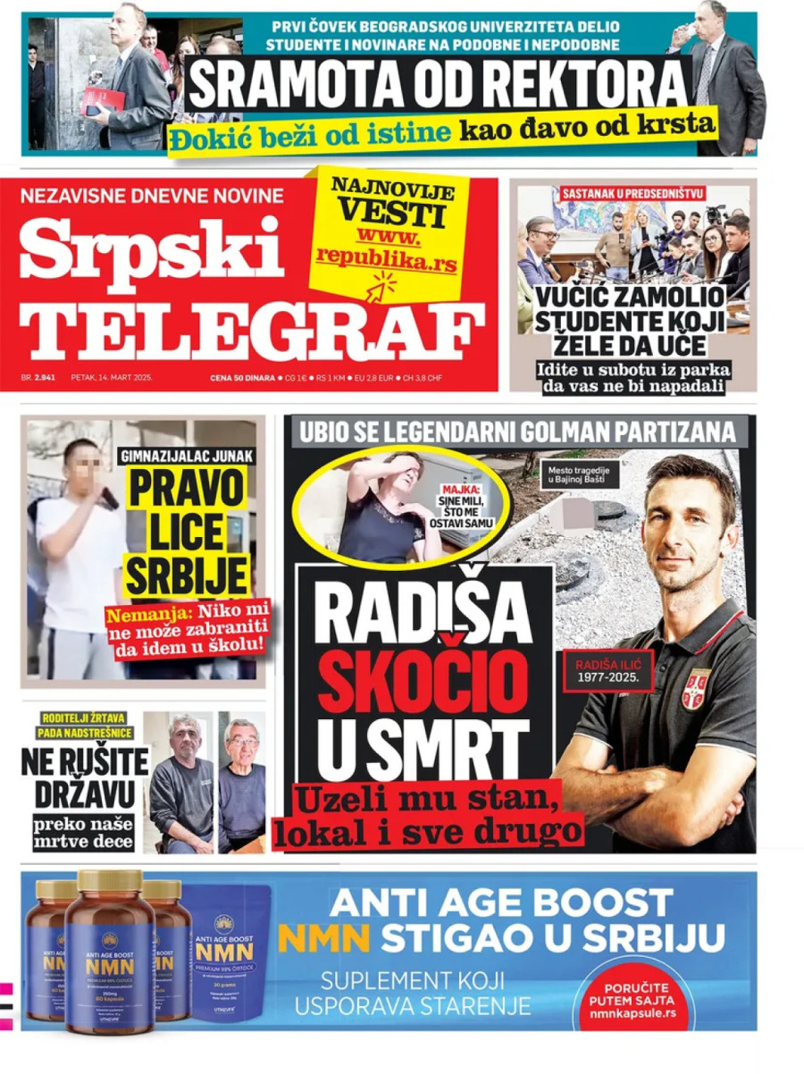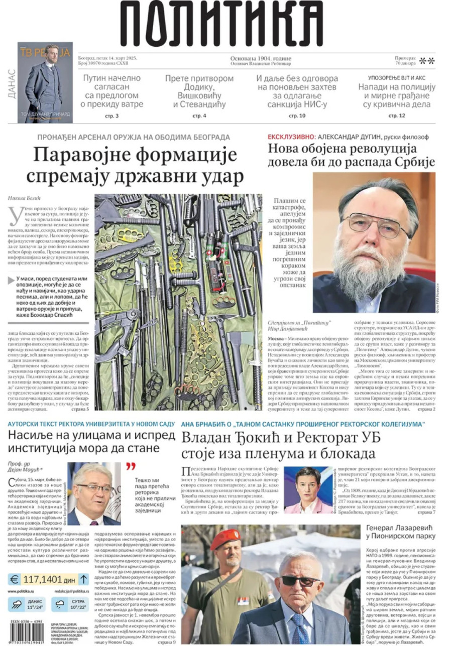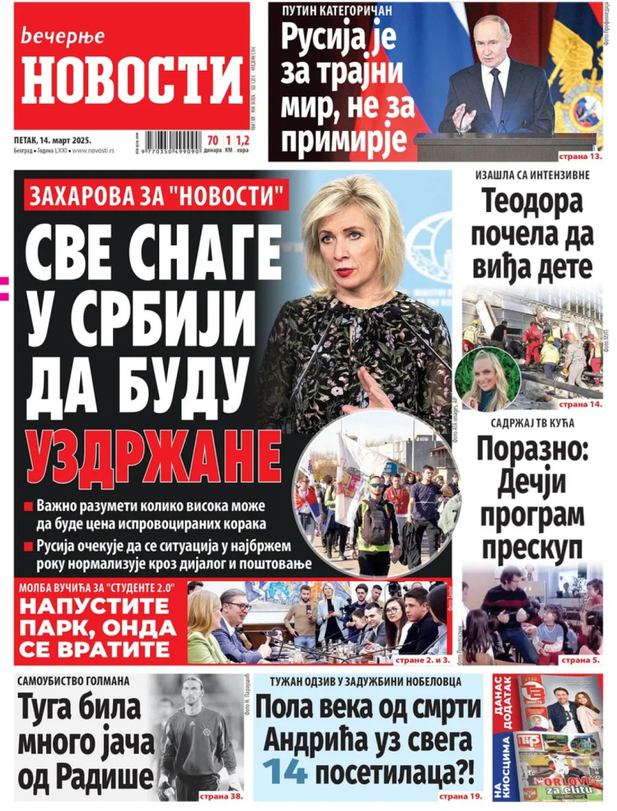 Dnevne novine u Srbiji za petak, 14. mart 2025. godine, na naslovnim stranama najavljuju brojne aktuelne društveno-političke teme i donose ekskluzivne priče.