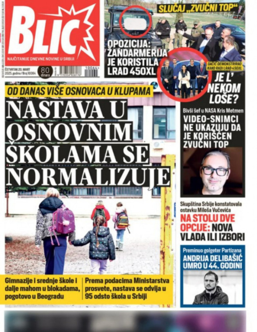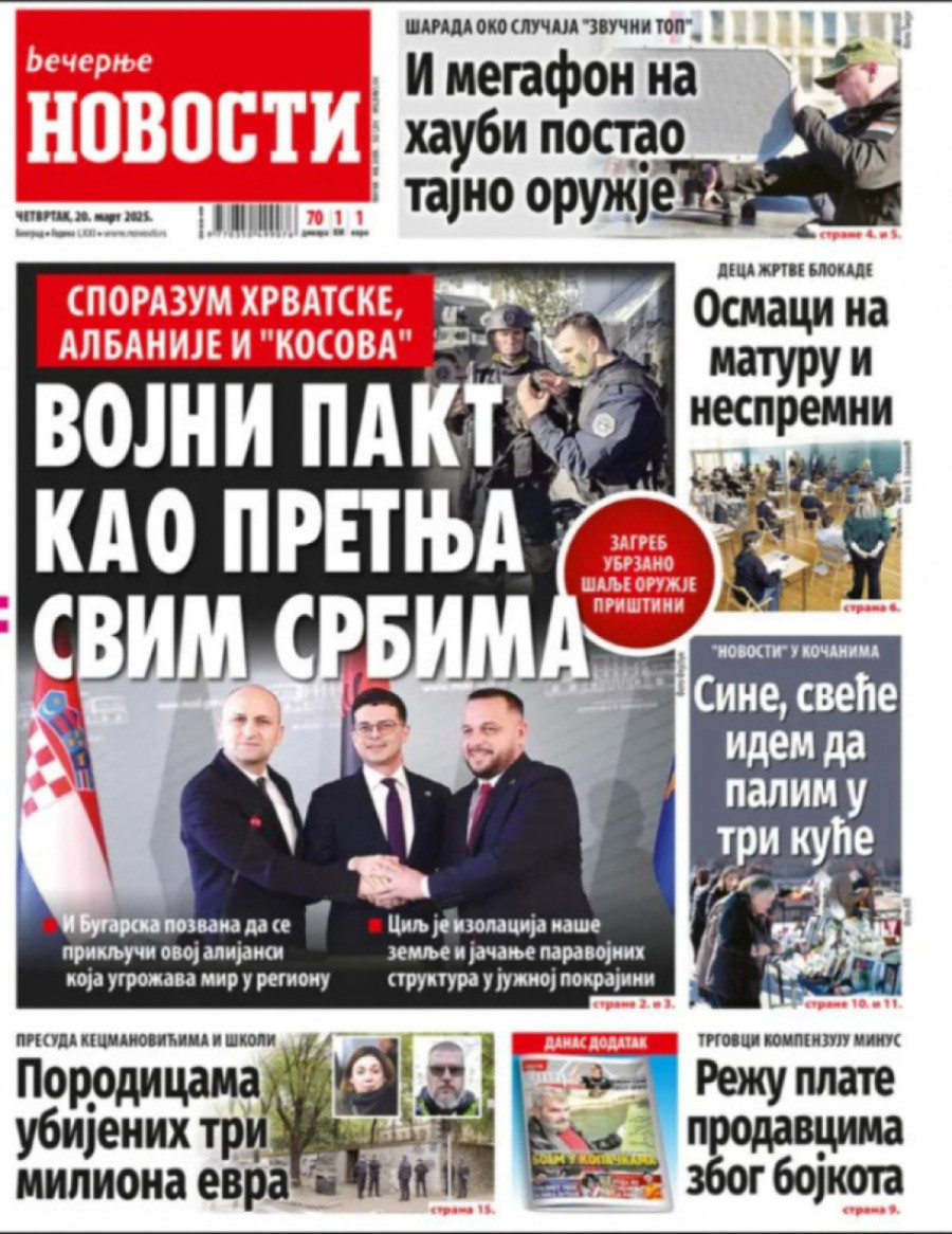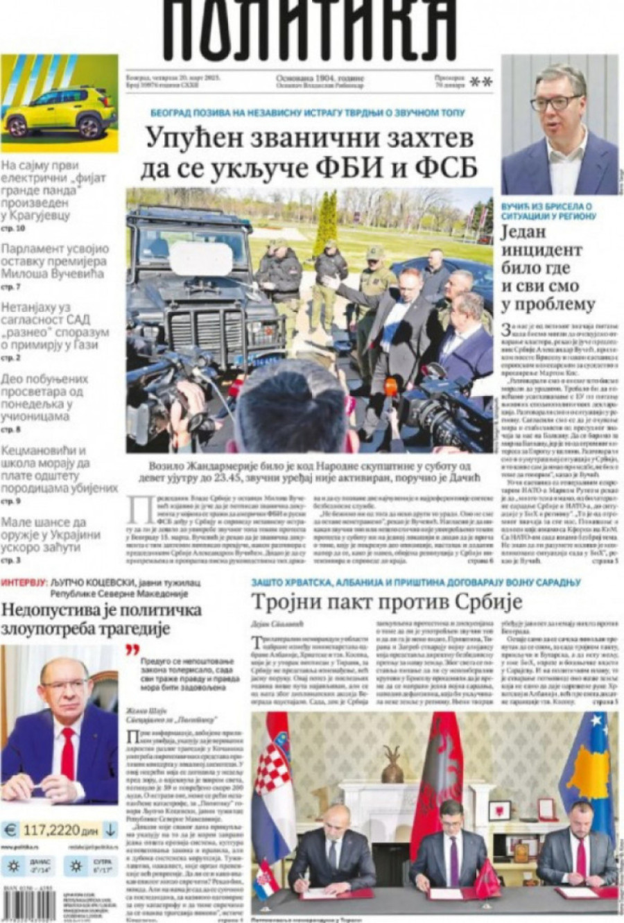 Dnevne novine u Srbiji za četvrtak, 20. mart 2025. godine, na naslovnim stranama najavljuju brojne aktuelne društveno-političke teme i donose ekskluzivne priče.