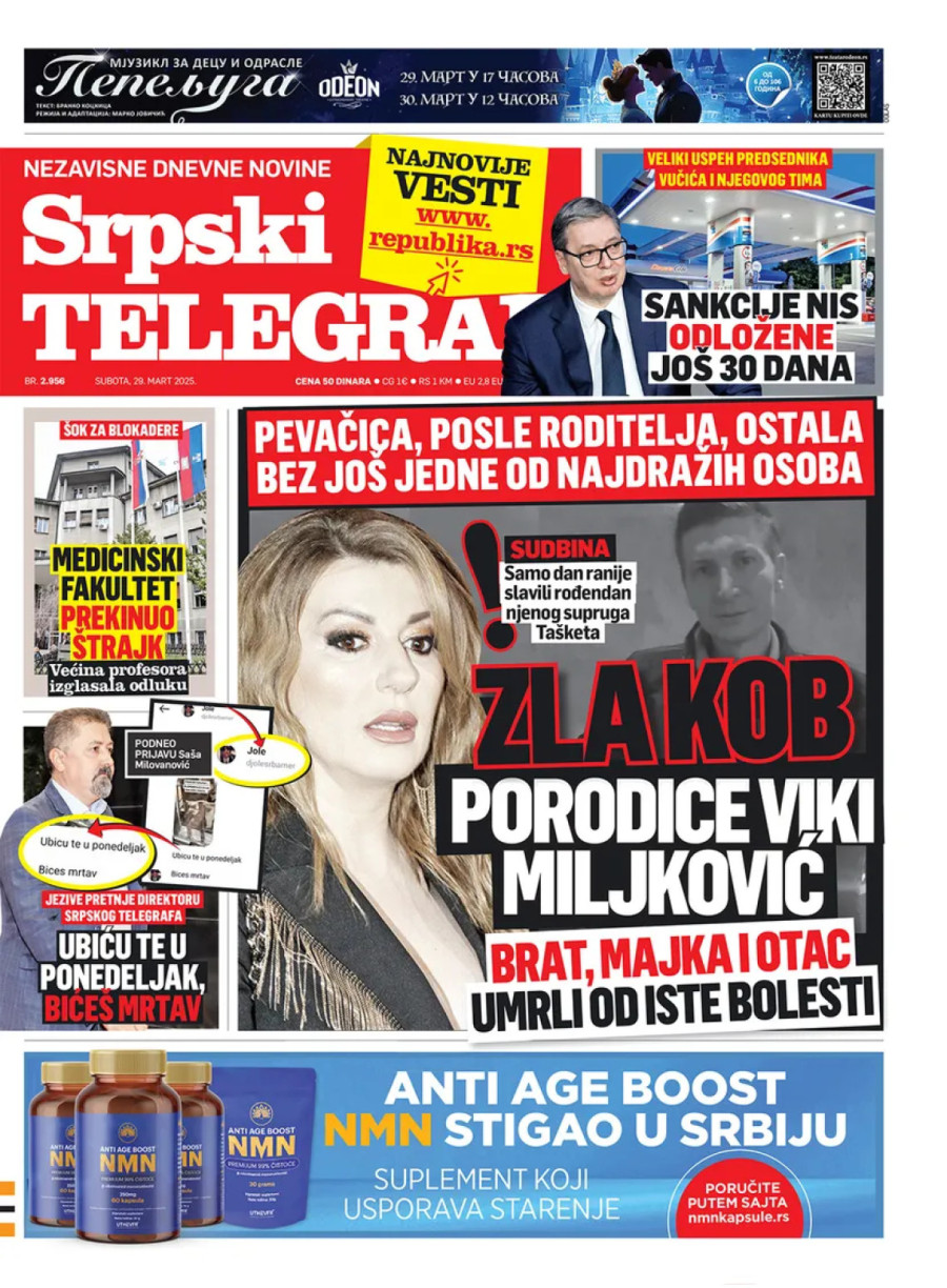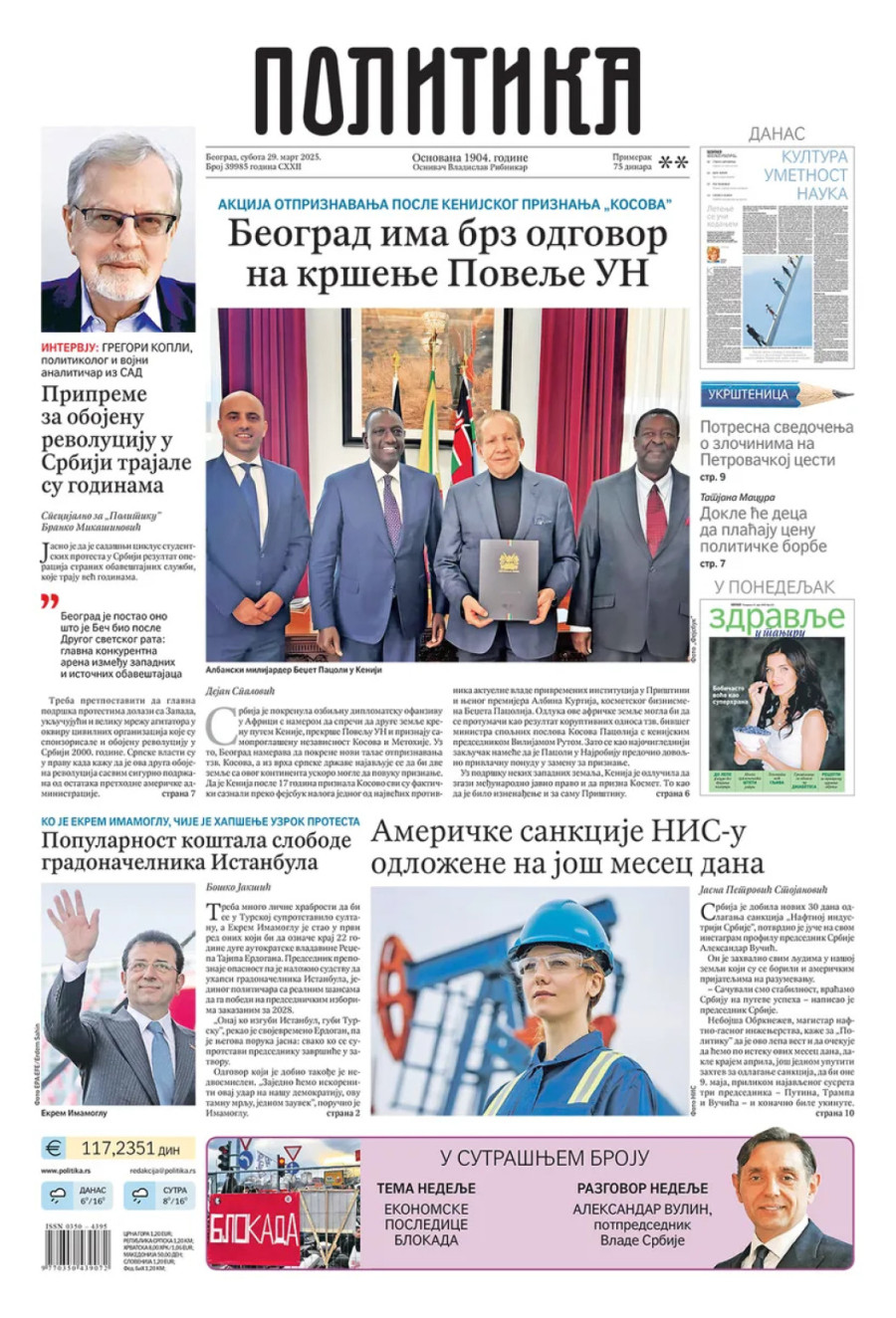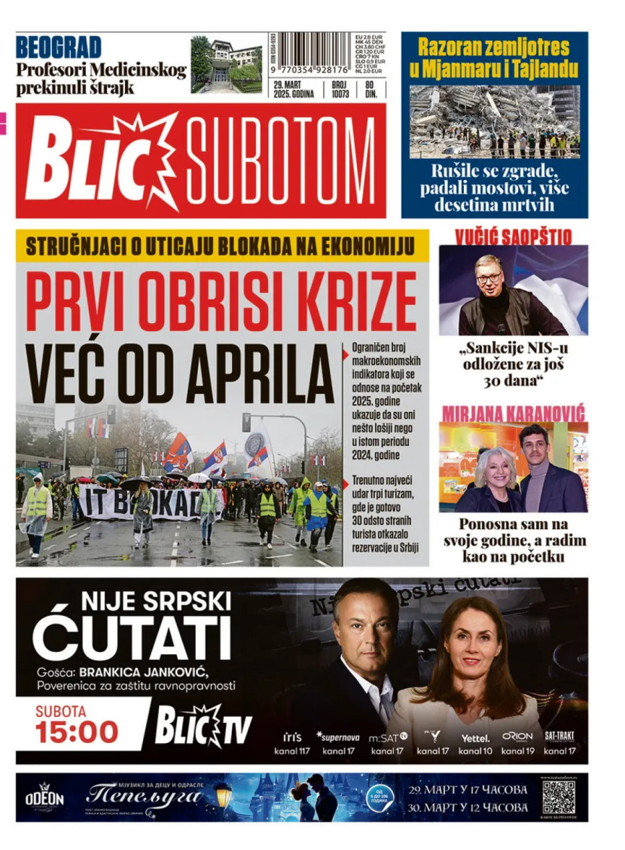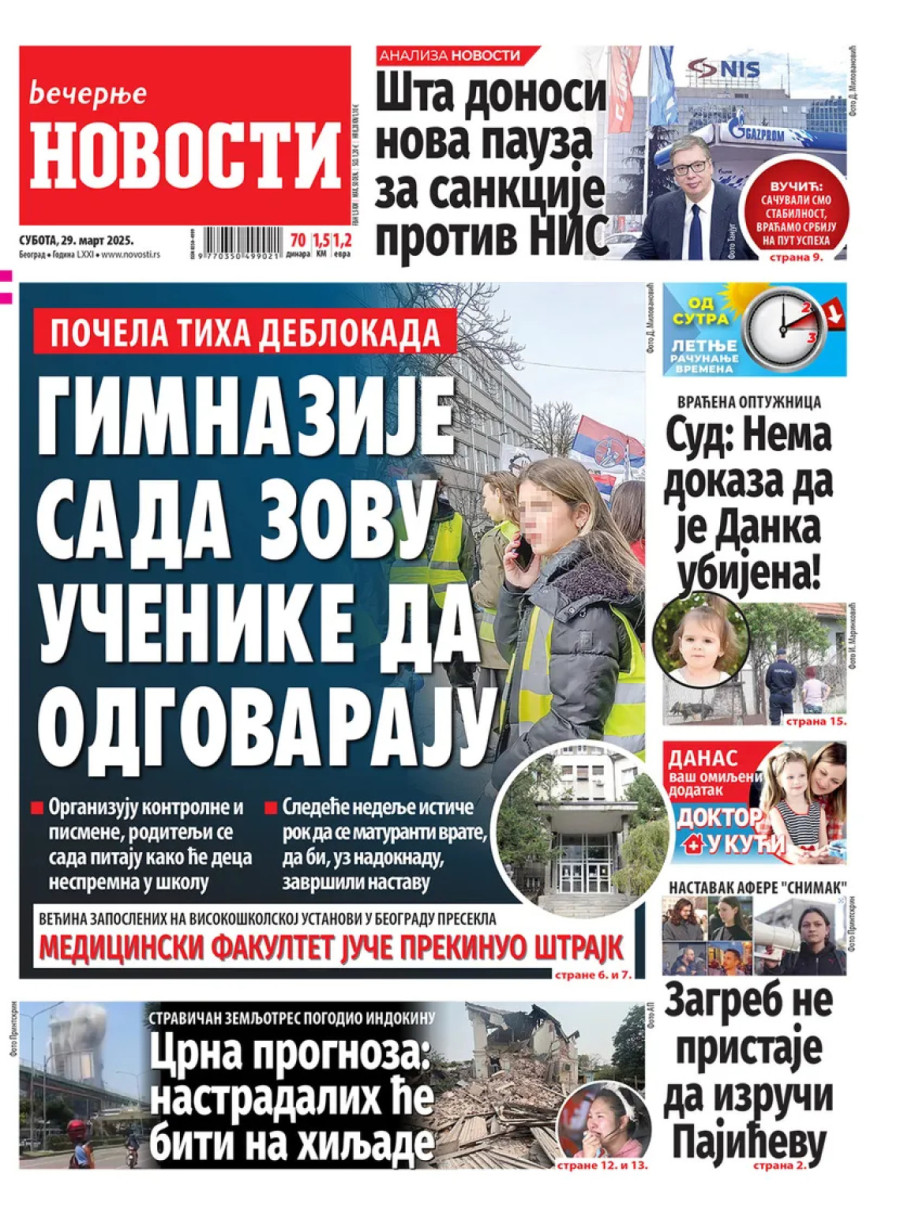 Dnevne novine u Srbiji za subotu, 29. mart 2025. godine, na naslovnim stranama najavljuju brojne aktuelne društveno-političke teme i donose ekskluzivne priče.