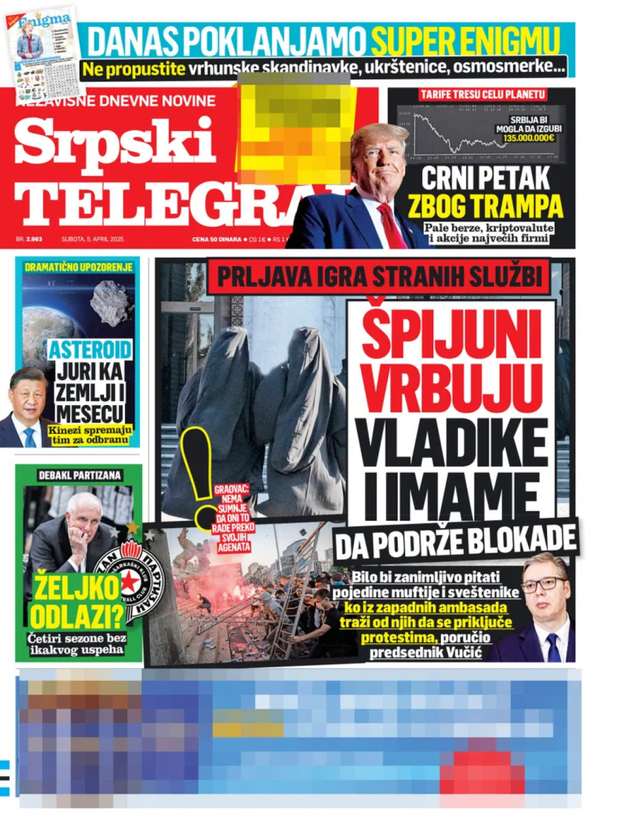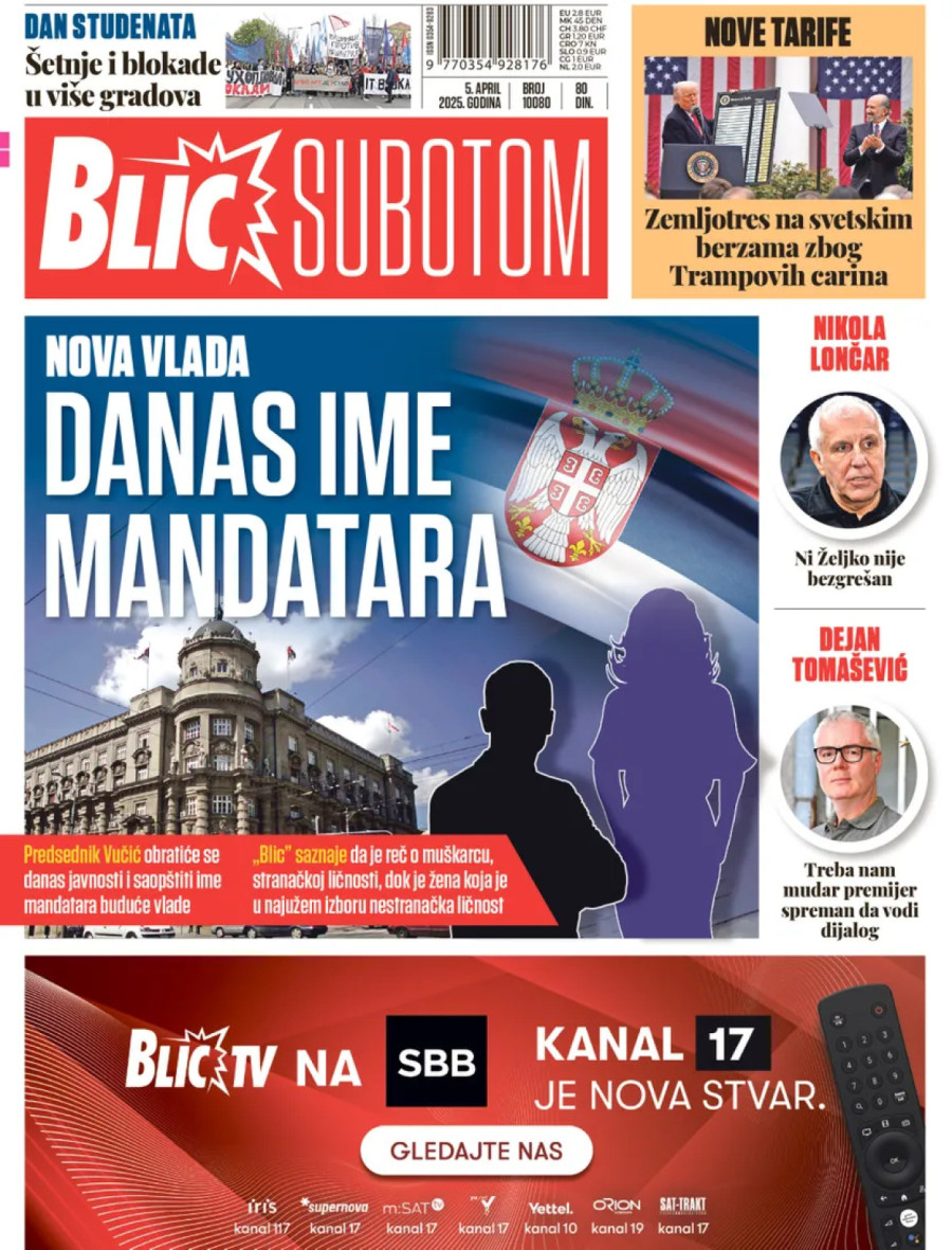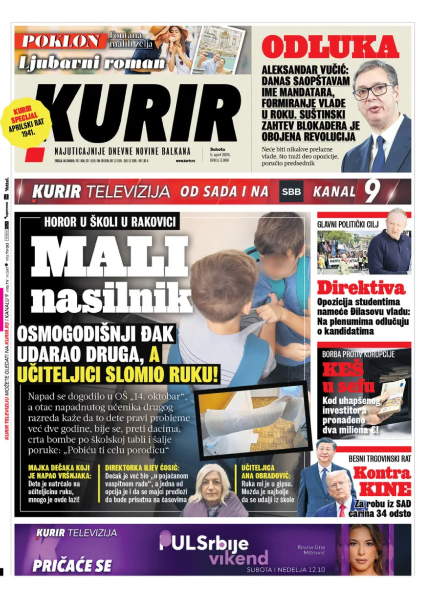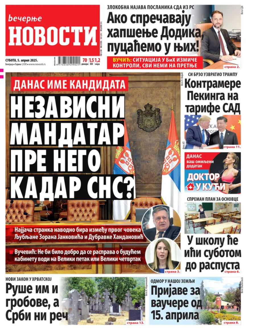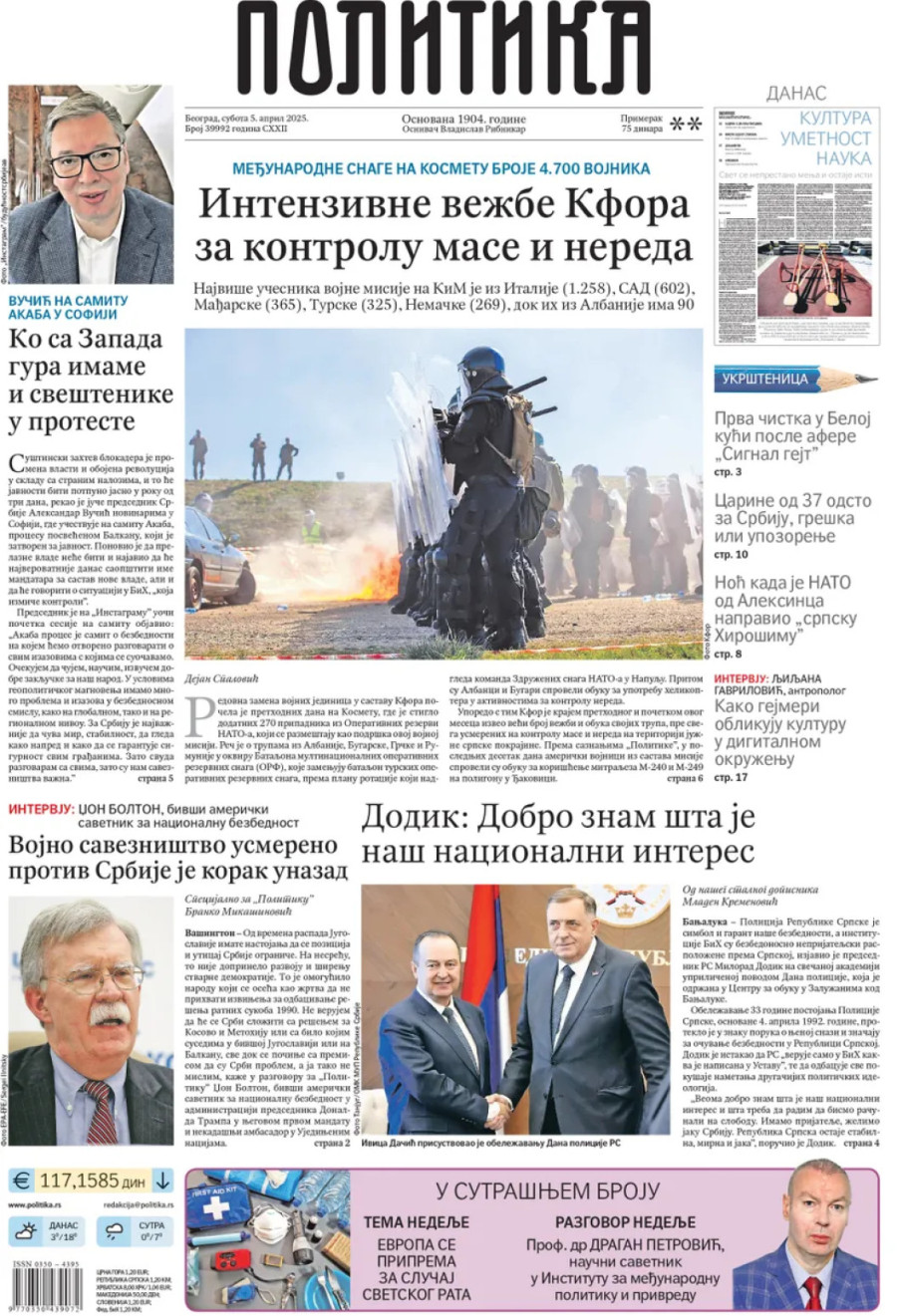 Dnevne novine u Srbiji za subotu, 5. april 2025. godine, na naslovnim stranama najavljuju brojne aktuelne društveno-političke teme i donose ekskluzivne priče.
