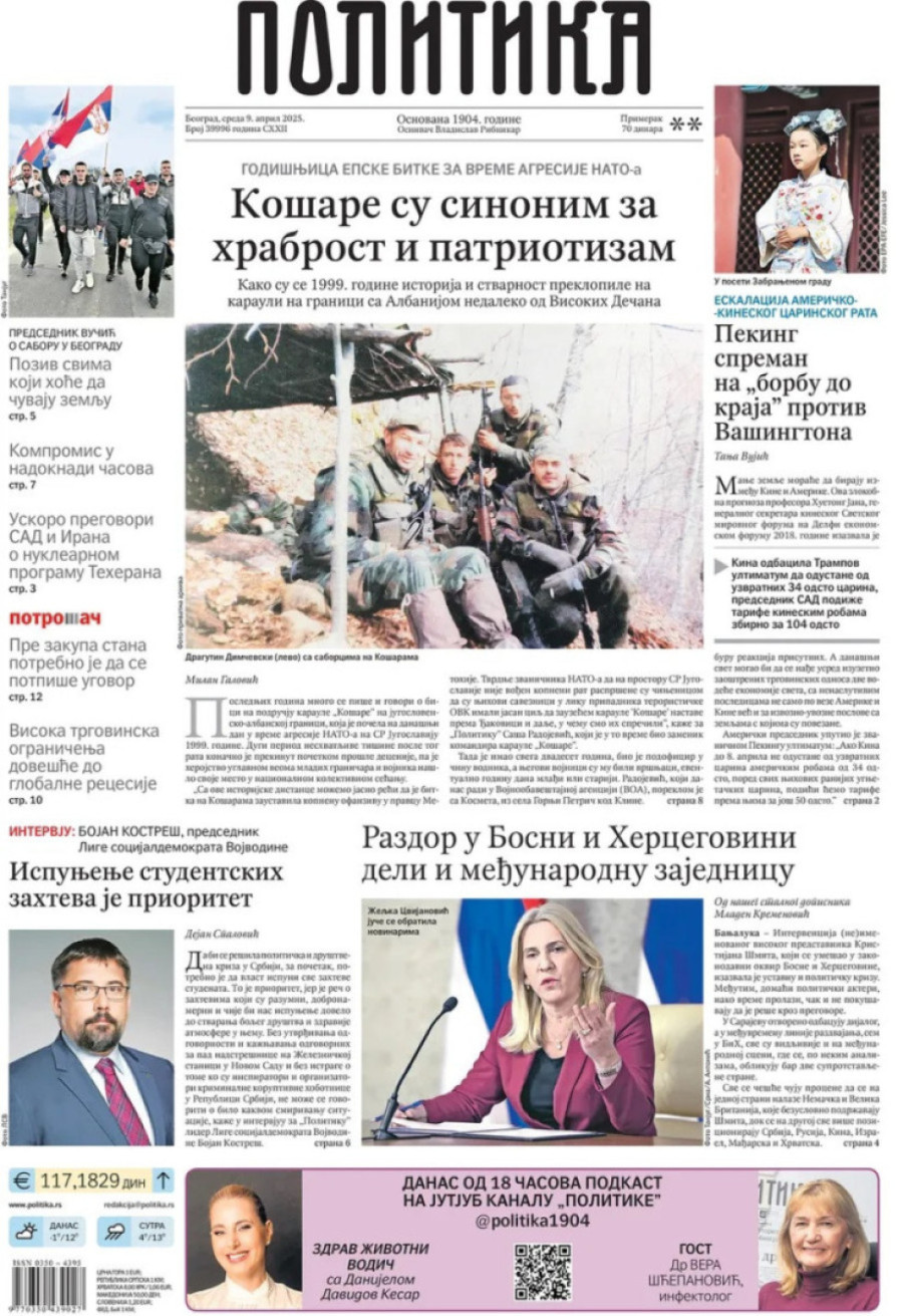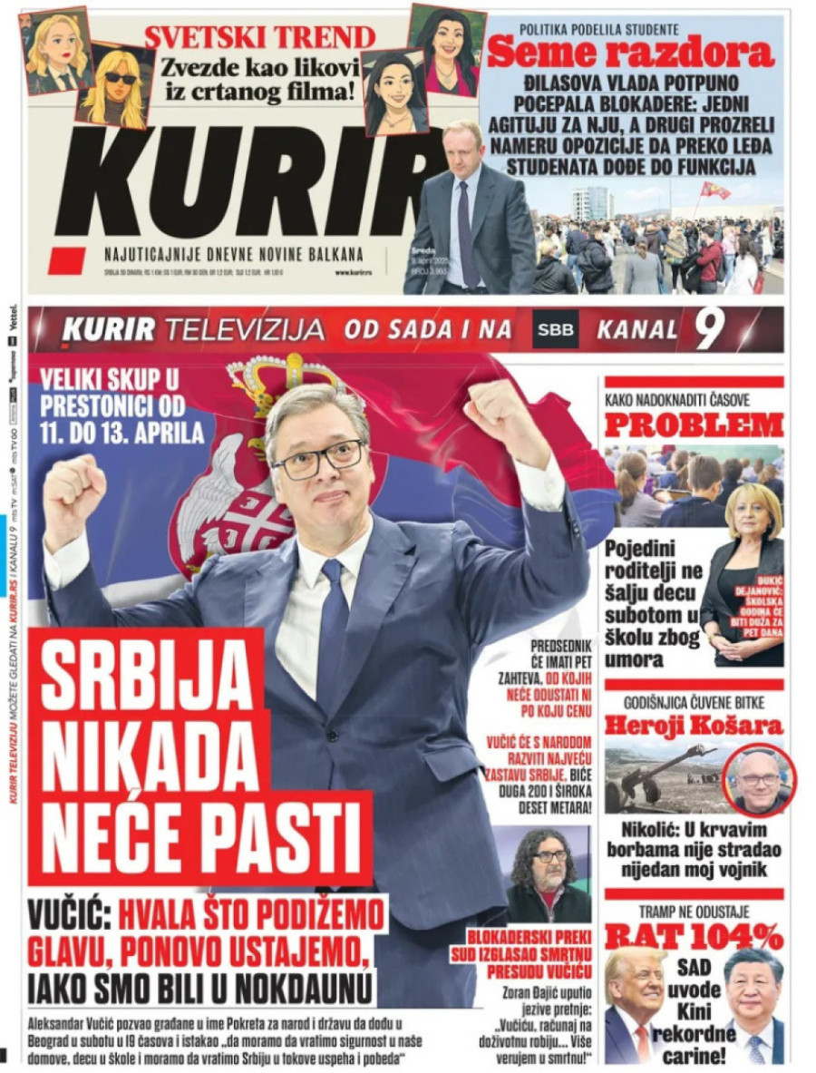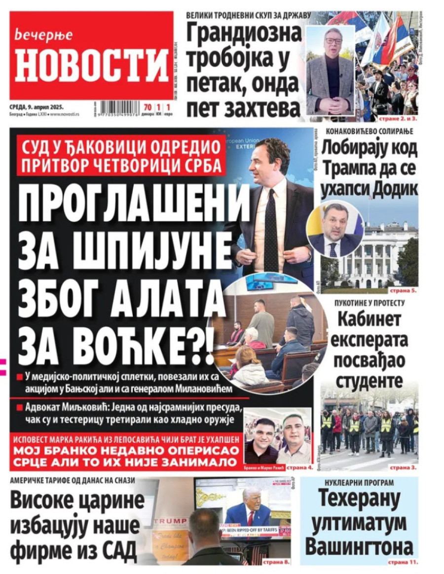 Dnevne novine u Srbiji za sredu 9. april 2025. godine, na naslovnim stranama najavljuju brojne aktuelne društveno-političke teme i donose ekskluzivne priče.