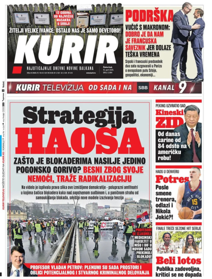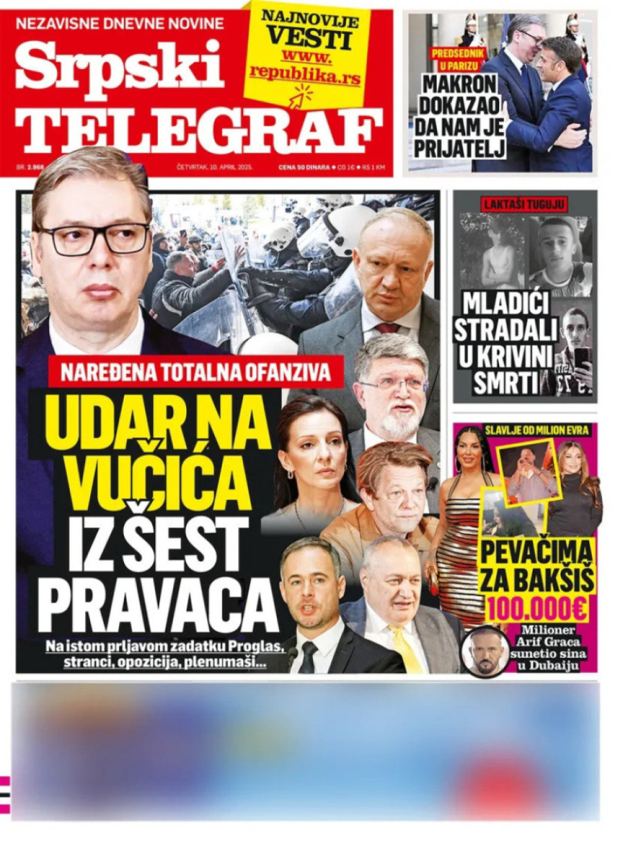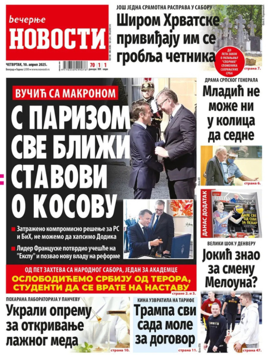 Dnevne novine u Srbiji za četvrtak 10. april 2025. godine, na naslovnim stranama najavljuju brojne aktuelne društveno-političke teme i donose ekskluzivne priče.